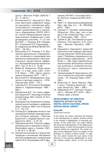 В статье автор рассматривает особенности развития созидательной творческой деятельности в условиях цифровизации повседневных процессов. При этом автор определяет структурные характеристики цифрового социально - культурного пространства, в котором организовываются процессы творческой деятельности человека. Автор выделяет интеллектуальный фактор как триггер активации творческой созидательной деятельности. Кроме того, автор раскрывает двойственную природу влияния процесса цифровизации на активизацию творческую деятельность, где с одной стороны этот процесс предоставляет через неограниченный доступ к информационным ресурсам, запуская процессы обогащения образовательной среды, с другой стороны в границах алгоритмизации, платформизации, сетевизации творческого человека невозможно рассматривать созидательным началом новой реальности. Автор акцентирует внимание на творческую личность, которая осознает и оценивает новизну и значение своего труда в новых условиях.