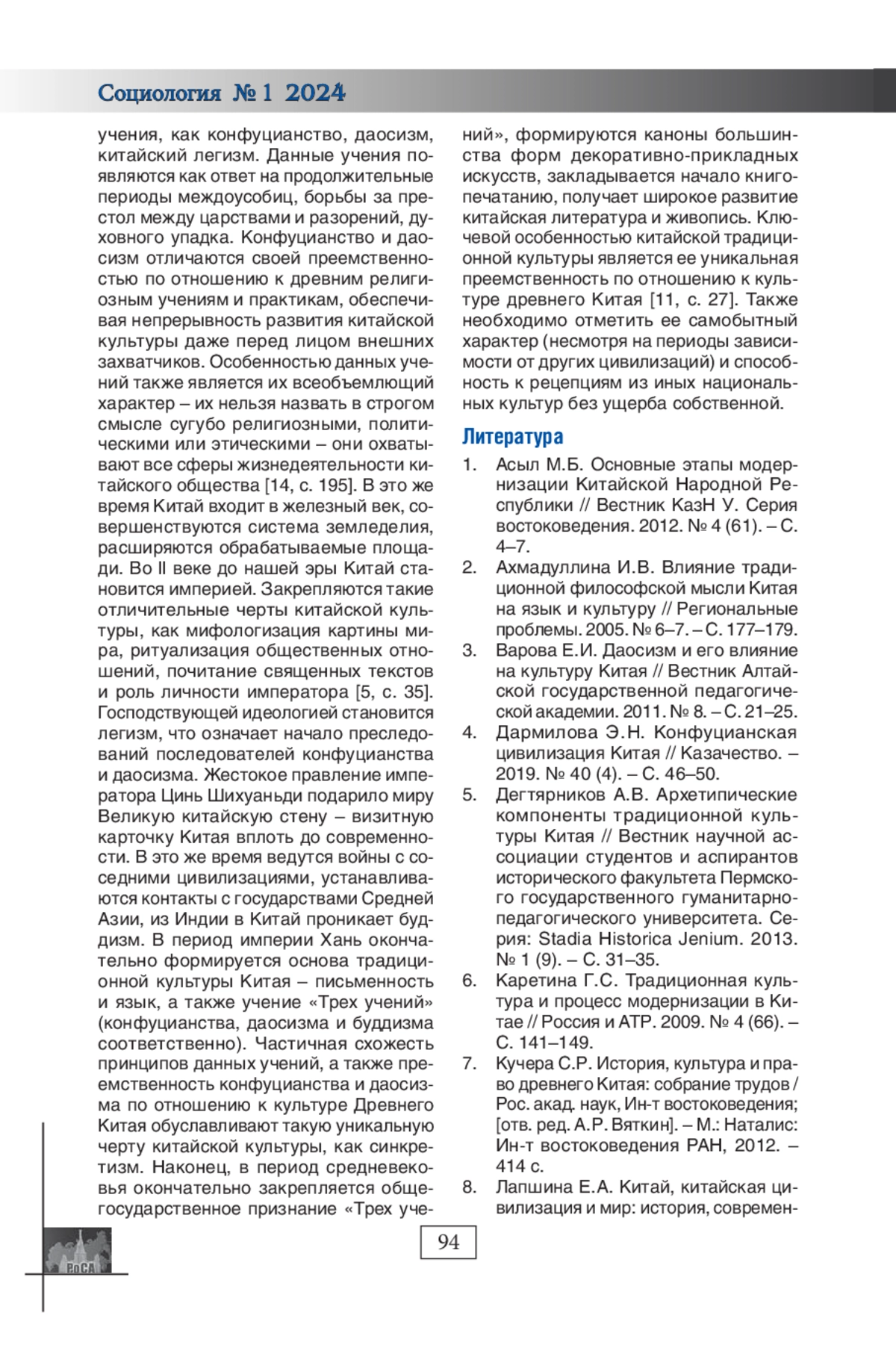 11. Минянь Ци, Абрамова Н.А. Традиционная китайская культура и формирование социокультурного пространства Китая // Вестник ЗабГ У. 2010. № 8. - С. 26-32.