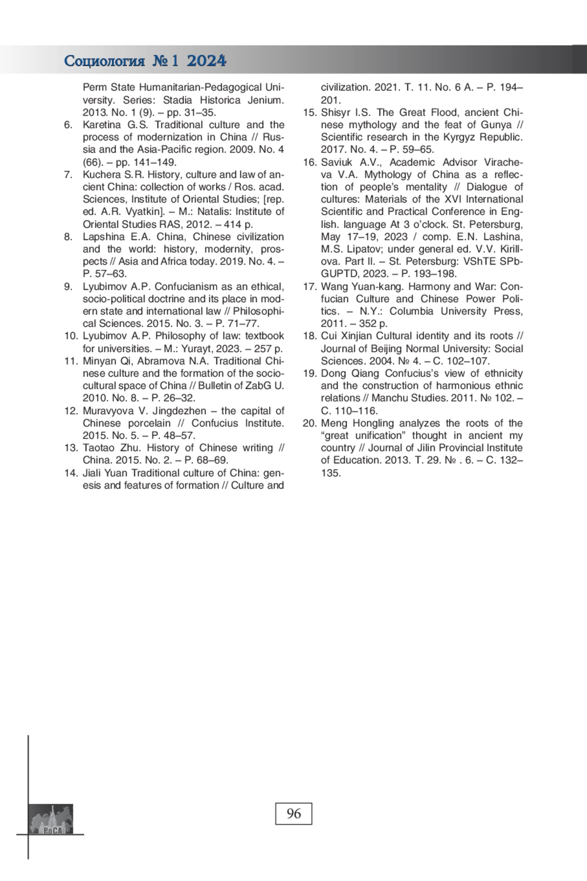 19. Dong Qiang Confucius’s view of ethnicity and the construction of harmonious ethnic relations // Manchu Studies. 2011. №. 102. - С. 110-116.