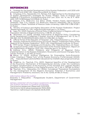 14. Ткачук П.Ю., Матюшко Е.В. Концептуальные теоретические основы развития экономического потенциала региона // Экономика и управление: проблемы, решения. 2024. Т. 9, № 12(153). С. 81-88.