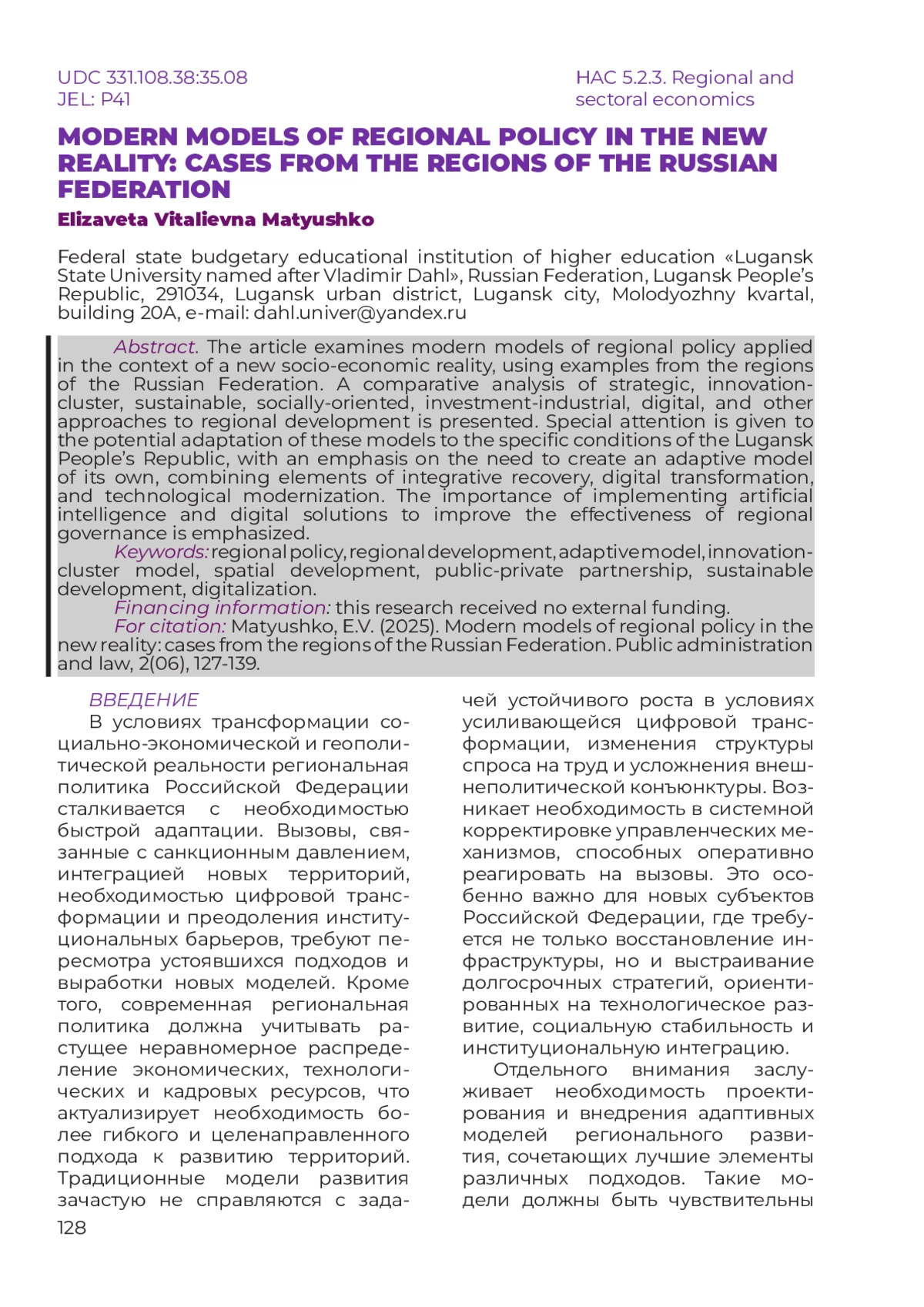 В статье рассмотрены современные модели региональной политики, применяемые в условиях новой социально-экономической реальности на примерах регионов Российской Федерации. Проведён сравнительный анализ стратегического, инновационно-кластерного, устойчивого, социально-ориентированного, инвестиционно-промышленного, цифрового и других подходов к региональному развитию. Особое внимание уделено возможности адаптации указанных моделей в специфических условиях Луганской Народной Республики с акцентом на необходимость создания собственной адаптивной модели, сочетающей в себе элементы интеграционного восстановления, цифровой трансформации и технологической модернизации. Подчёркивается значение внедрения искусственного интеллекта и цифровых решений для повышения эффективности регионального управления.