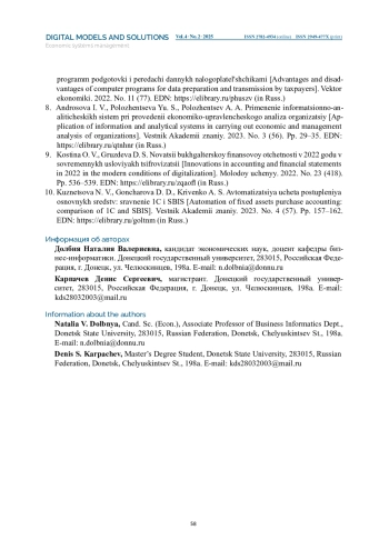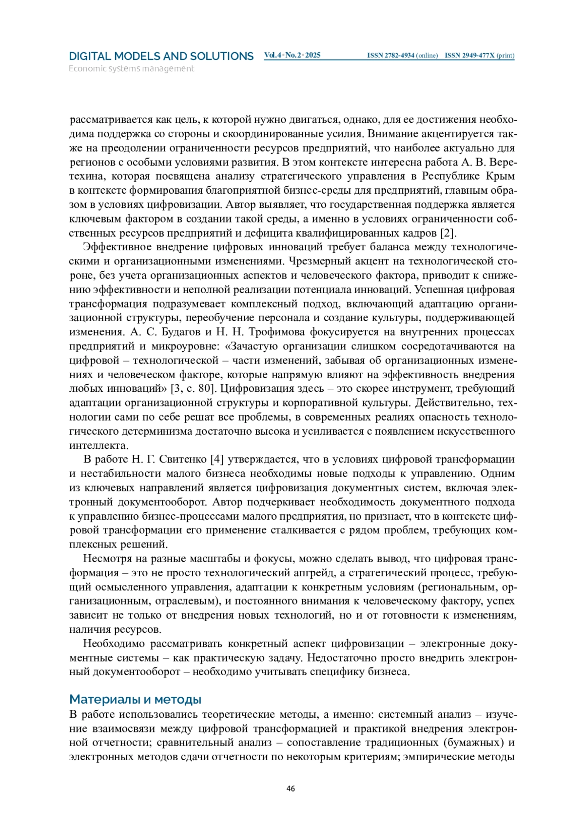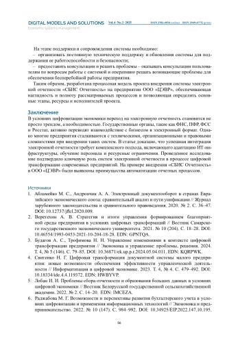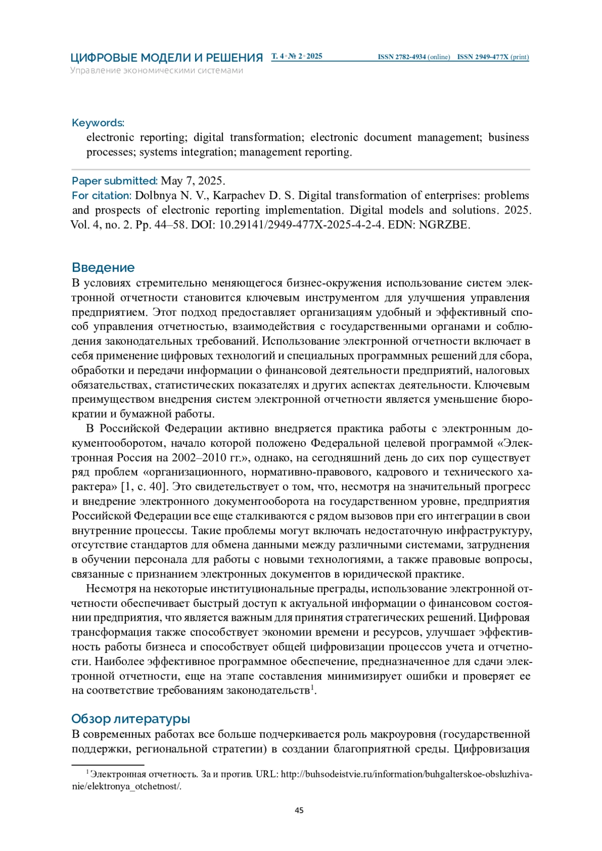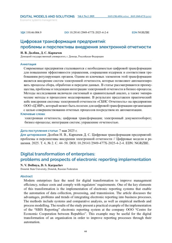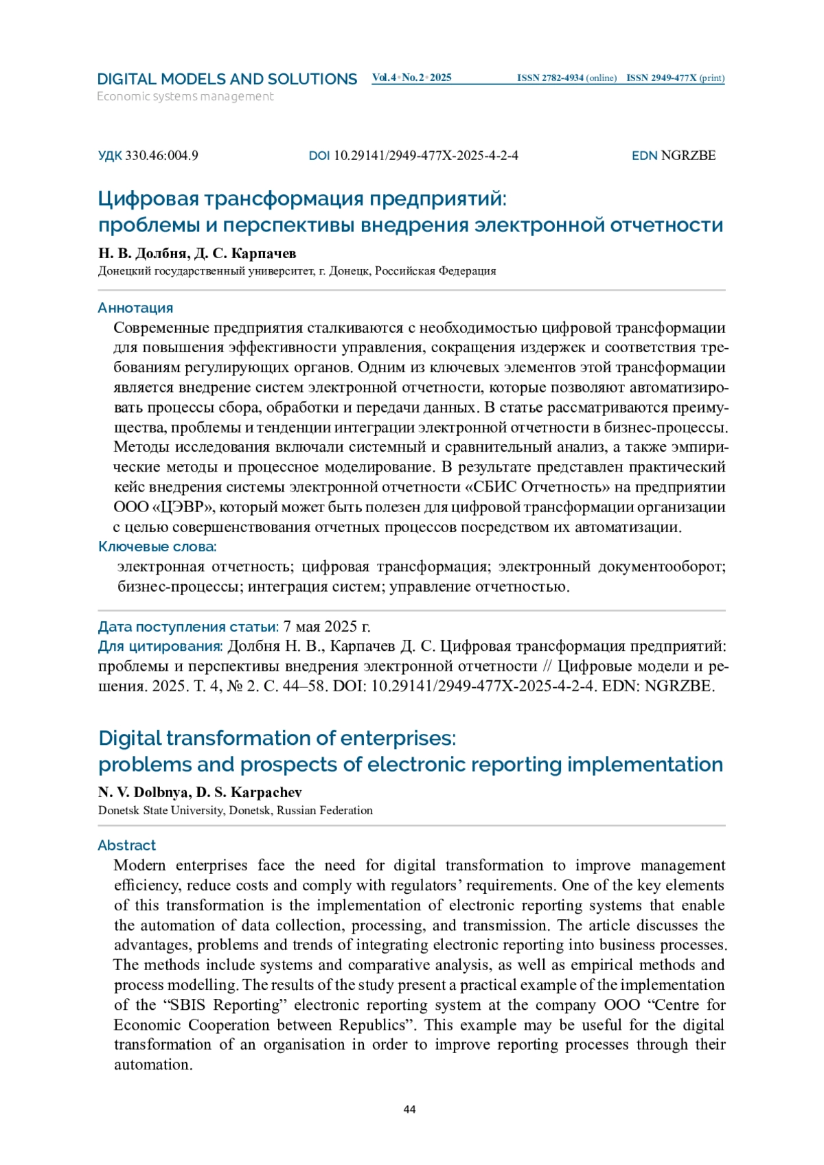 ДОЛБНЯ Н. В., КАРПАЧЕВ Д. С. ЦИФРОВАЯ ТРАНСФОРМАЦИЯ ПРЕДПРИЯТИЙ: ПРОБЛЕМЫ И ПЕРСПЕКТИВЫ ВНЕДРЕНИЯ ЭЛЕКТРОННОЙ ОТЧЕТНОСТИ // ЦИФРОВЫЕ МОДЕЛИ И РЕШЕНИЯ. 2025. Т. 4 № 2