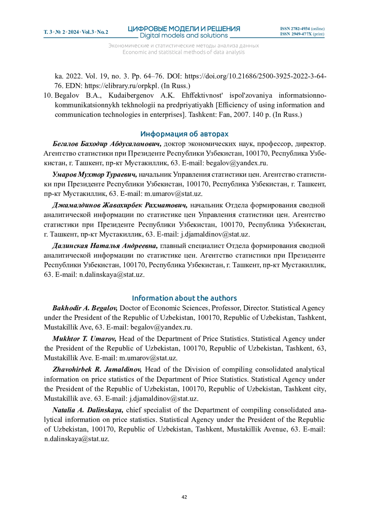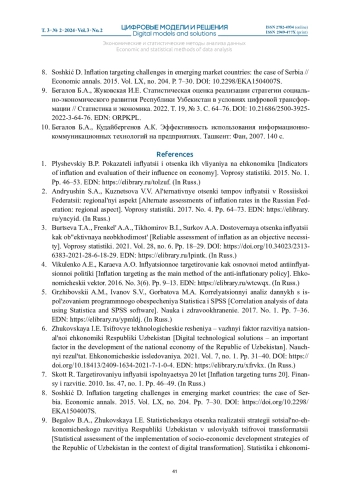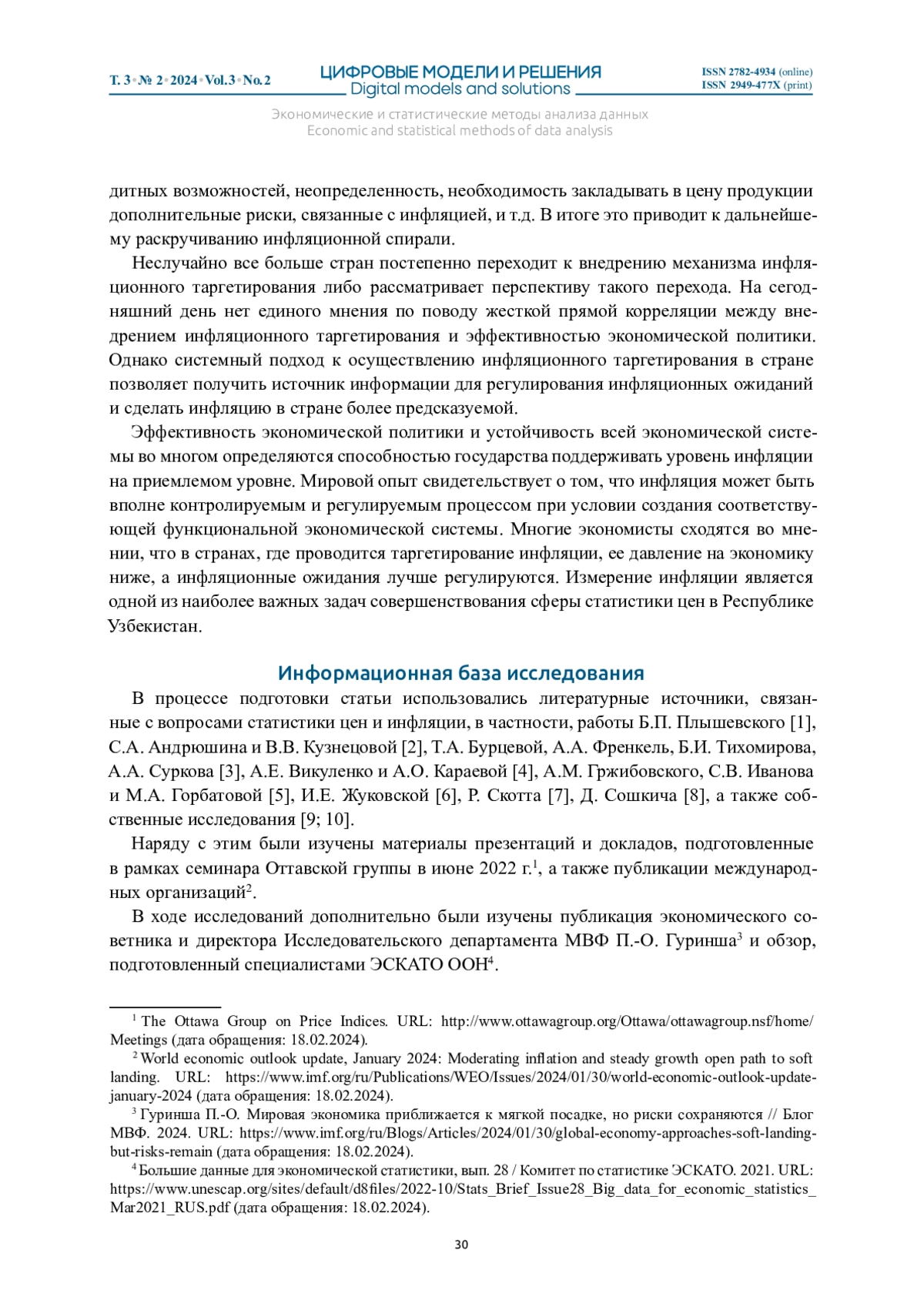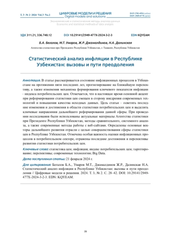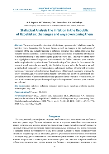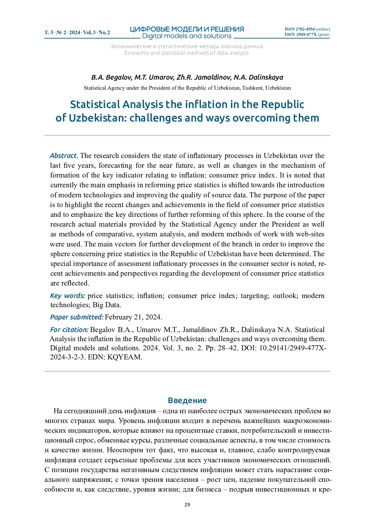БЕГАЛОВ Б. А., УМАРОВ М. Т., ДЖАМАЛДИНОВ Ж. Р., ДАЛИНСКАЯ Н. А. СТАТИСТИЧЕСКИЙ АНАЛИЗ ИНФЛЯЦИИ В РЕСПУБЛИКЕ УЗБЕКИСТАН: ВЫЗОВЫ И ПУТИ ПРЕОДОЛЕНИЯ // ЦИФРОВЫЕ МОДЕЛИ И РЕШЕНИЯ. 2024. Т. 3 № 2