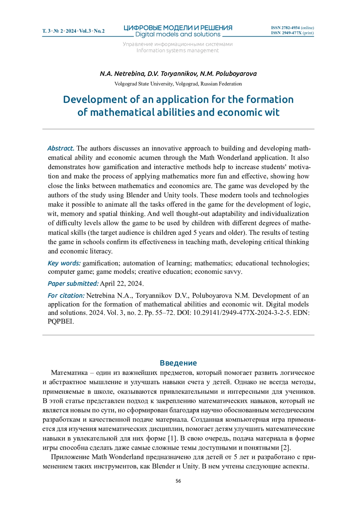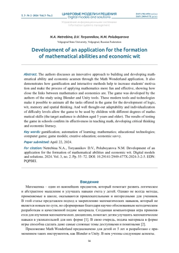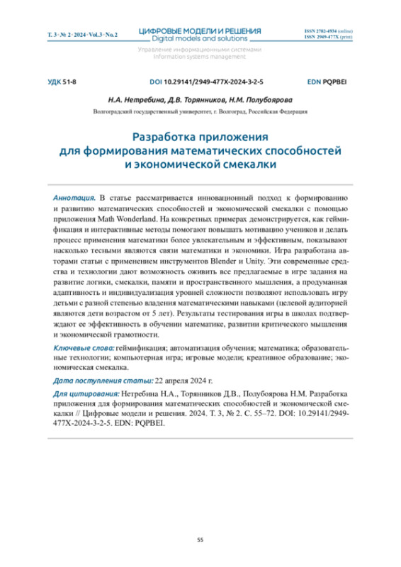НЕТРЕБИНА Н. А., ТОРЯННИКОВ Д. В., ПОЛУБОЯРОВА Н. М. РАЗРАБОТКА ПРИЛОЖЕНИЯ ДЛЯ ФОРМИРОВАНИЯ МАТЕМАТИЧЕСКИХ СПОСОБНОСТЕЙ И ЭКОНОМИЧЕСКОЙ СМЕКАЛКИ // ЦИФРОВЫЕ МОДЕЛИ И РЕШЕНИЯ. 2024. Т. 3 № 2