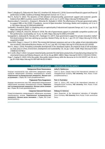 54. Razumovskaia E., Yuzvovich L., Kniazeva E., Klimenko M., Shelyakin V. (2020). The effectiveness of Russian government policy to support SMEs in the COVID-19 pandemic. Journal of Open Innovation: Technology, Market, and Complexity, vol. 6, no. 4, p. 160. DOI: 10.3390/joitmc6040160 EDN: SJKOIX