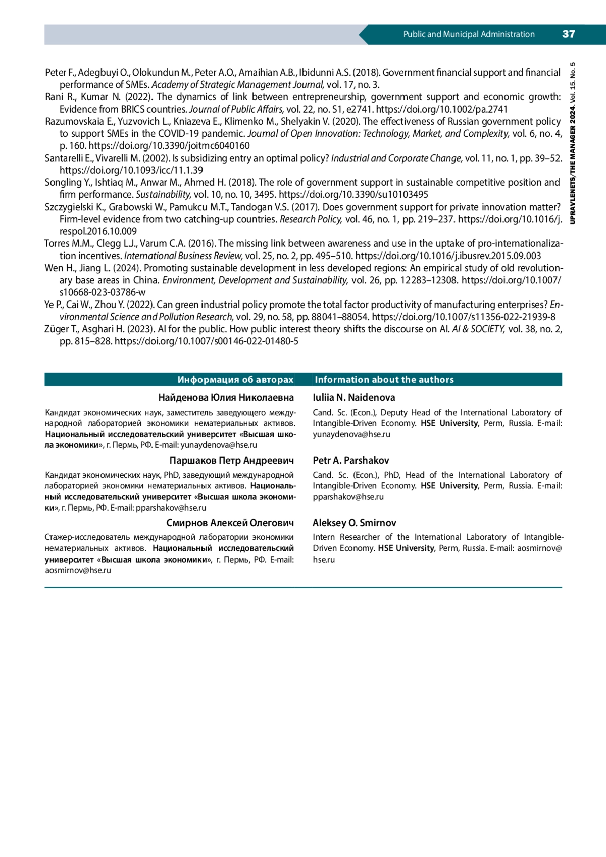 53. Rani R., Kumar N. (2022). The dynamics of link between entrepreneurship, government support and economic growth: Evidence from BRICS countries. Journal of Public Affairs, vol. 22, no. S1, e2741. DOI: 10.1002/pa.2741 EDN: VJJGLL