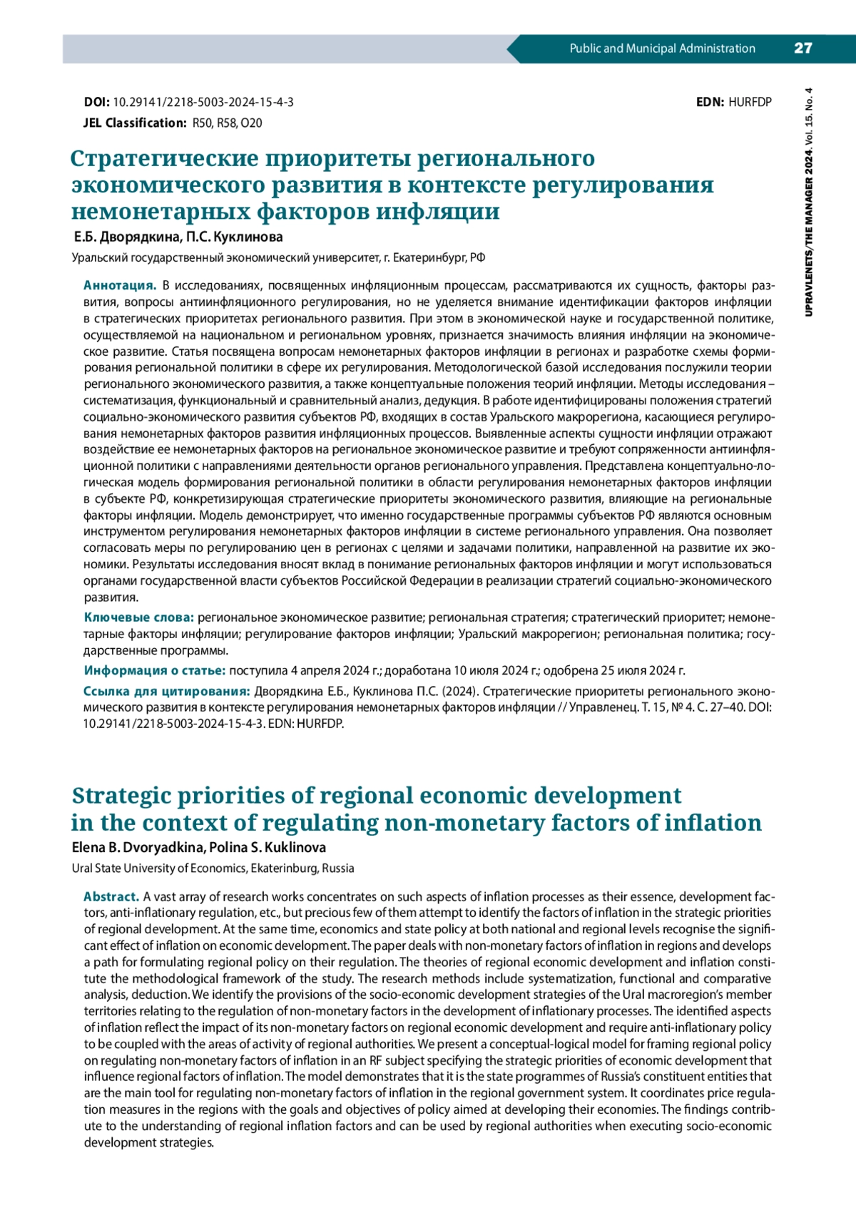 28. Kiseleva P.S. (2018). Regional inflation in Russia and ways of controlling it. R-Economy, vol. 4, issue 2, pp. 39-43. DOI: 10.15826/recon.2018.4.2.006 EDN: UYPBOA