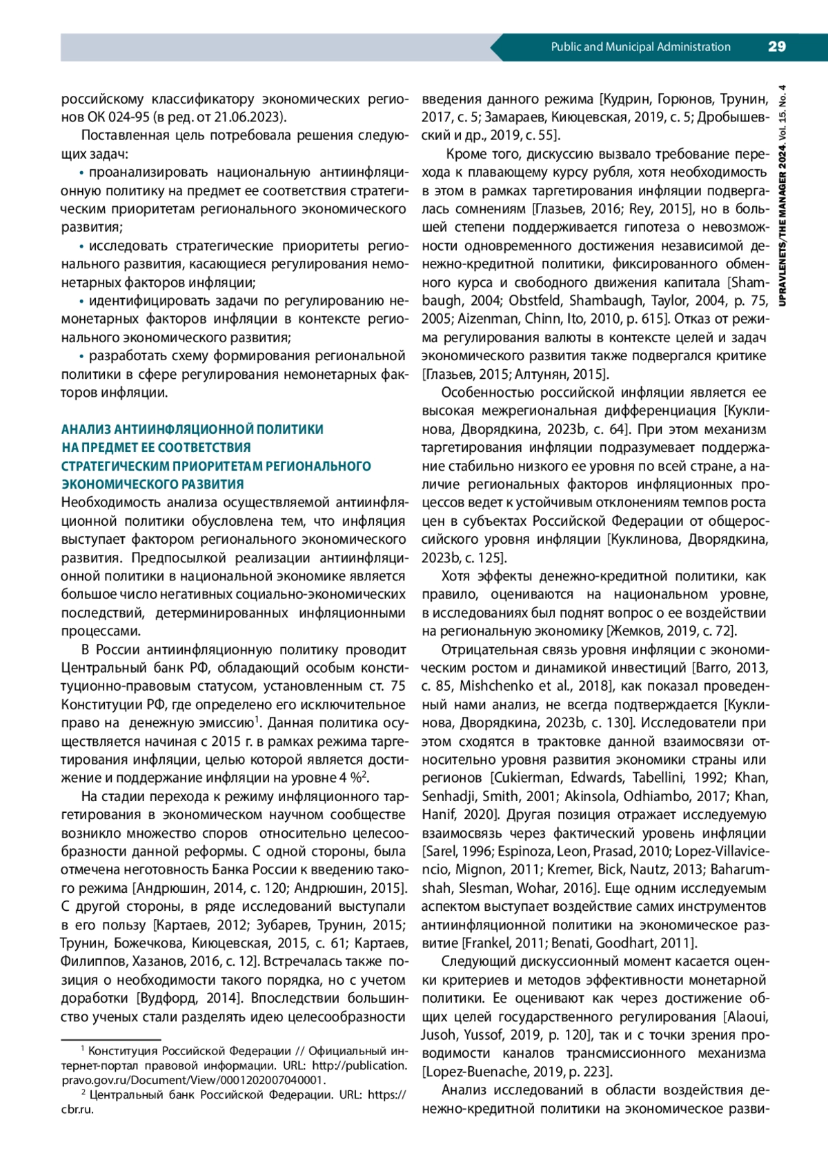 2. Андрюшин С.А. (2014). Перспективы режима таргетирования инфляции в России // Вопросы экономики. № 11. С. 107-121. Андрюшин С.А. (2015). Аргументы в пользу управления обменным курсом рубля // Вопросы экономики. № 12. С. 51-68. EDN: UXMGOT