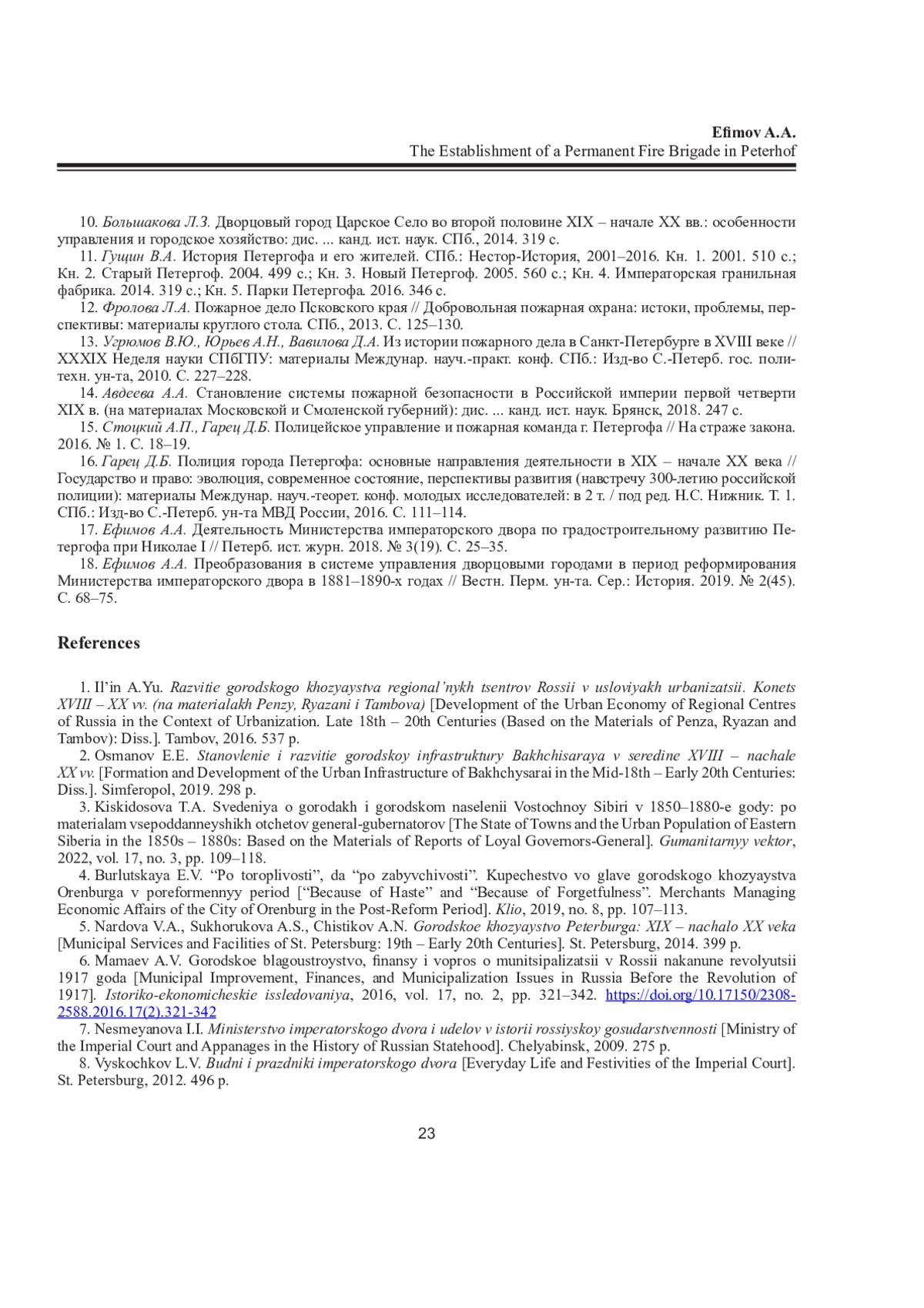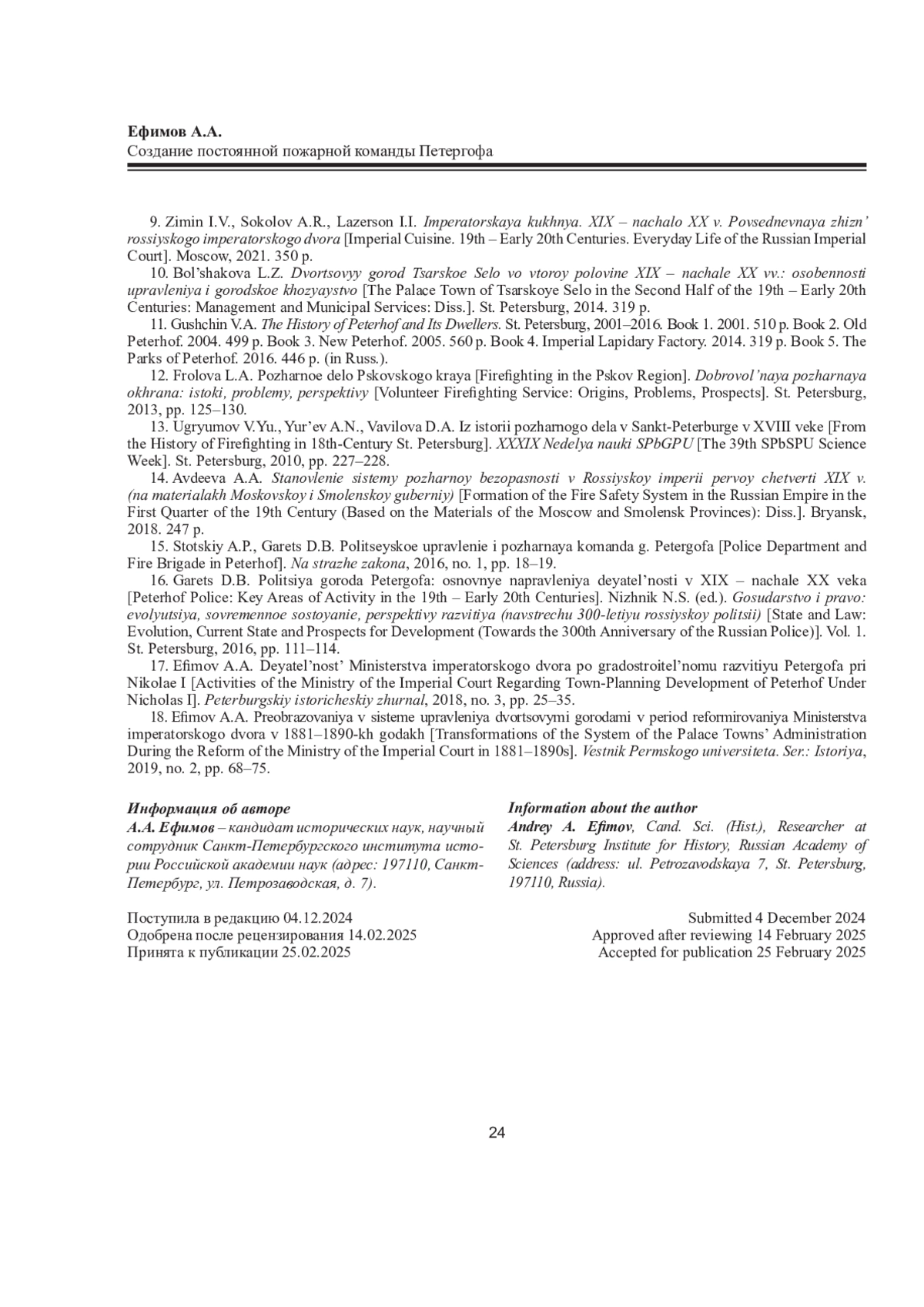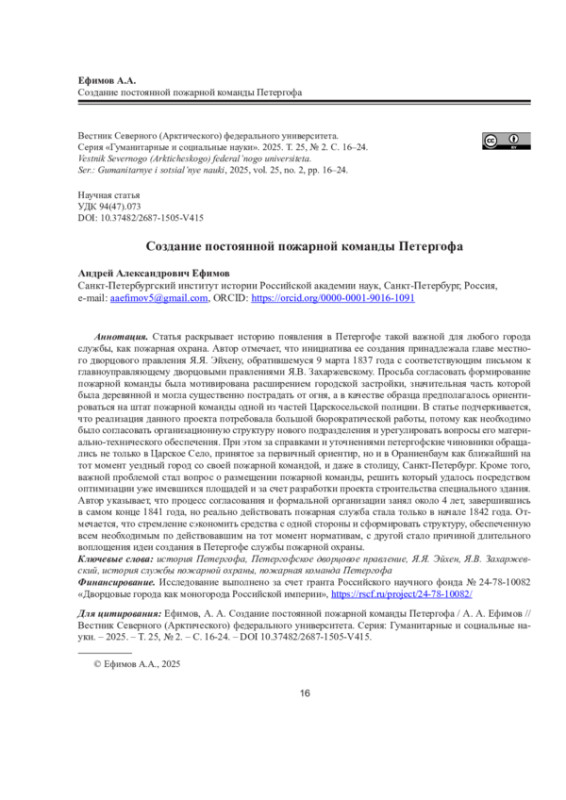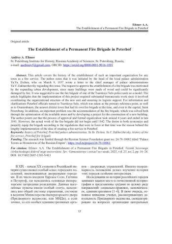 ЕФИМОВ А. А. СОЗДАНИЕ ПОСТОЯННОЙ ПОЖАРНОЙ КОМАНДЫ ПЕТЕРГОФА // ВЕСТНИК СЕВЕРНОГО (АРКТИЧЕСКОГО) ФЕДЕРАЛЬНОГО УНИВЕРСИТЕТА. СЕРИЯ: ГУМАНИТАРНЫЕ И СОЦИАЛЬНЫЕ НАУКИ. 2025. Т. 25 № 2