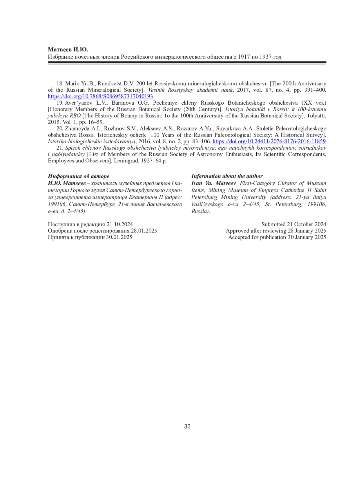 18. Марин Ю.Б., Рундквист Д.В. 200 лет Российскому минералогическому обществу // Вестн. Рос. акад. наук. 2017. Т. 87, No 4. С. 391-400. DOI: 10.7868/S0869587317040193 EDN: YQRCXB