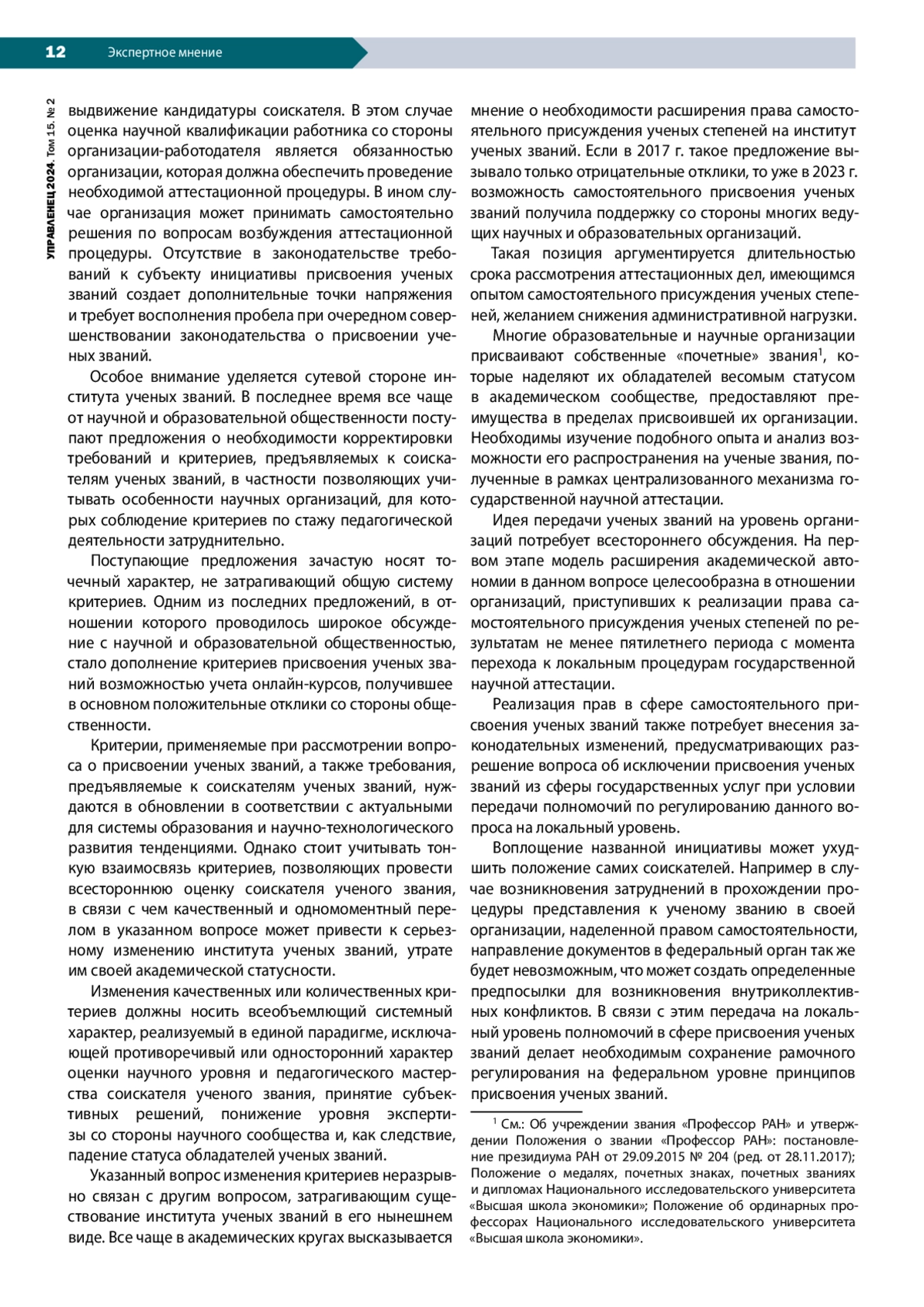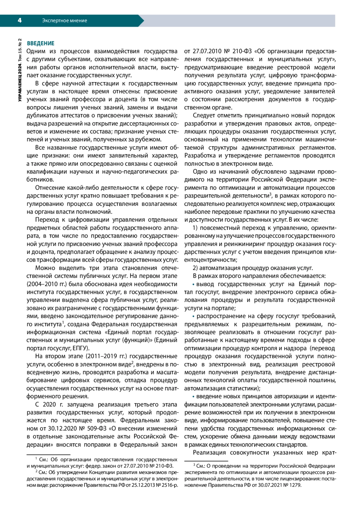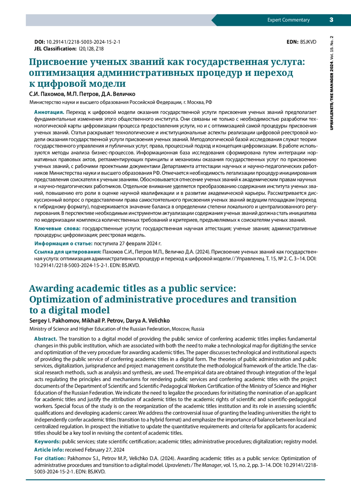 ПАХОМОВ С. И., ПЕТРОВ М. П., ВЕЛИЧКО Д. А. ПРИСВОЕНИЕ УЧЕНЫХ ЗВАНИЙ КАК ГОСУДАРСТВЕННАЯ УСЛУГА: ОПТИМИЗАЦИЯ АДМИНИСТРАТИВНЫХ ПРОЦЕДУР И ПЕРЕХОД К ЦИФРОВОЙ МОДЕЛИ // УПРАВЛЕНЕЦ. 2024. Т. 15 № 2