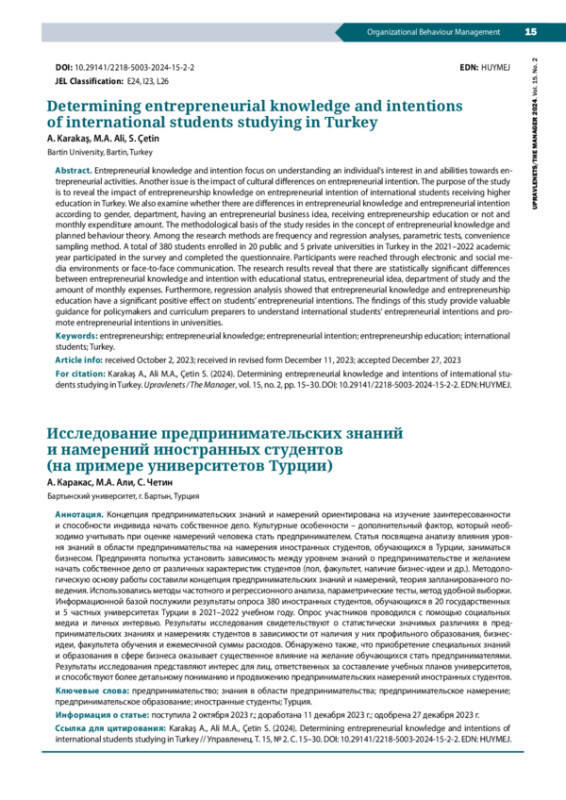 Концепция предпринимательских знаний и намерений ориентирована на изучение заинтересованности и способности индивида начать собственное дело. Культурные особенности – дополнительный фактор, который необходимо учитывать при оценке намерений человека стать предпринимателем. Статья посвящена анализу влияния уровня знаний в области предпринимательства на намерения иностранных студентов, обучающихся в Турции, заниматься бизнесом. Предпринята попытка установить зависимость между уровнем знаний о предпринимательстве и желанием начать собственное дело от различных характеристик студентов (пол, факультет, наличие бизнес-идеи и др.). Методологическую основу работы составили концепция предпринимательских знаний и намерений, теория запланированного поведения. Использовались методы частотного и регрессионного анализа, параметрические тесты, метод удобной выборки. Информационной базой послужили результаты опроса 380 иностранных студентов, обучающихся в 20 государственных и 5 частных университетах Турции в 2021–2022 учебном году. Опрос участников проводился с помощью социальных медиа и личных интервью. Результаты исследования свидетельствуют о статистически значимых различиях в предпринимательских знаниях и намерениях студентов в зависимости от наличия у них профильного образования, бизнесидеи, факультета обучения и ежемесячной суммы расходов. Обнаружено также, что приобретение специальных знаний и образования в сфере бизнеса оказывает существенное влияние на желание обучающихся стать предпринимателями. Результаты исследования представляют интерес для лиц, ответственных за составление учебных планов университетов, и способствуют более детальному пониманию и продвижению предпринимательских намерений иностранных студентов