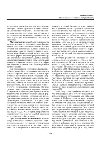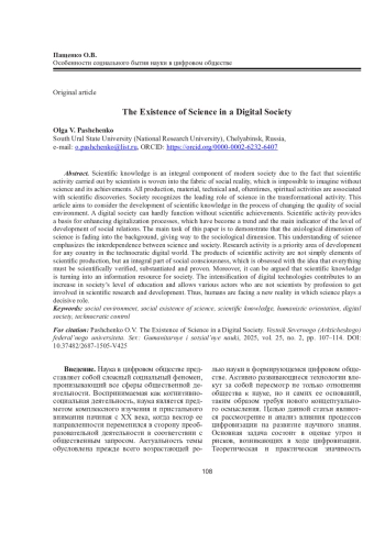 Наука в цифровом обществе пред- ставляет собой сложный социальный феномен, пронизывающий все сферы общественной деятельности. Воспринимаемая как когнитивносоциальная деятельность, наука является предметом комплексного изучения и пристального внимания начиная с ХХ века, когда вектор ее направленности переменился в сторону преобразовательной деятельности в соответствии с общественным запросом. Актуальность темы обусловлена прежде всего возрастающей ролью науки в формирующемся цифровом обществе.
