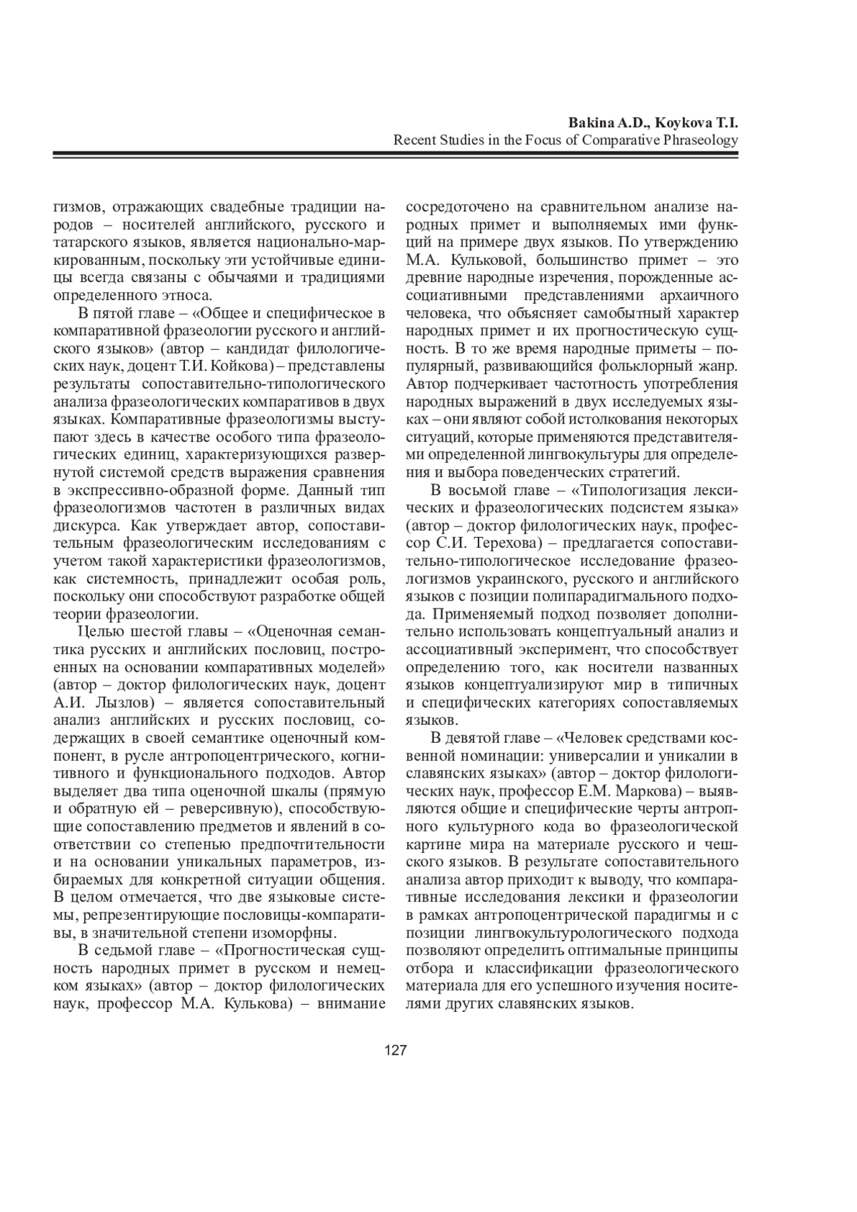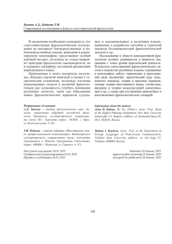 В рецензируемой монографии подробно освещаются результаты новейших исследований в области сопоставительной фразеологии, проведенных на репрезентативном фразеологическом материале ряда языков: русского, грузинского, белорусского, украинского, английского, немецкого, шведского, чешского, татарского. В частности, выявлены типологически релевантные характеристики описания фразеологических единиц на примере германских языков; представлен сопоставительный анализ фразеологических единиц библейской этимологии в русском и грузинском языках; определена национально-культурная специфика фразеологизмов, описывающих свадебные традиции в нескольких языках; рассмотрена категория оценки в русских и английских пословицах с компаративной семантикой. Фразеологические исследования в сопоставительном аспекте являются значимыми в теоретическом и практическом плане, адресованы специалистам в области фразеологии, фразеографии, сопоставительного языкознания и перевода.
