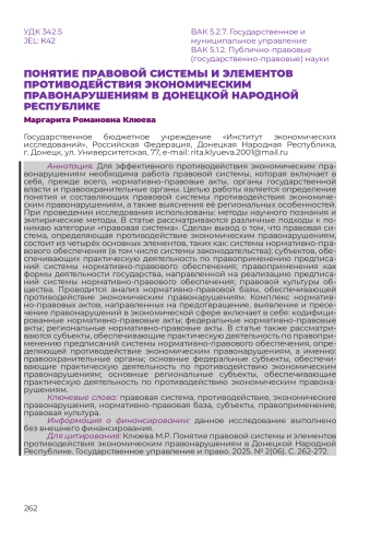 Статья: ПОНЯТИЕ ПРАВОВОЙ СИСТЕМЫ И ЭЛЕМЕНТОВ ПРОТИВОДЕЙСТВИЯ ЭКОНОМИЧЕСКИМ ПРАВОНАРУШЕНИЯМ В ДОНЕЦКОЙ НАРОДНОЙ РЕСПУБЛИКЕ (2025)