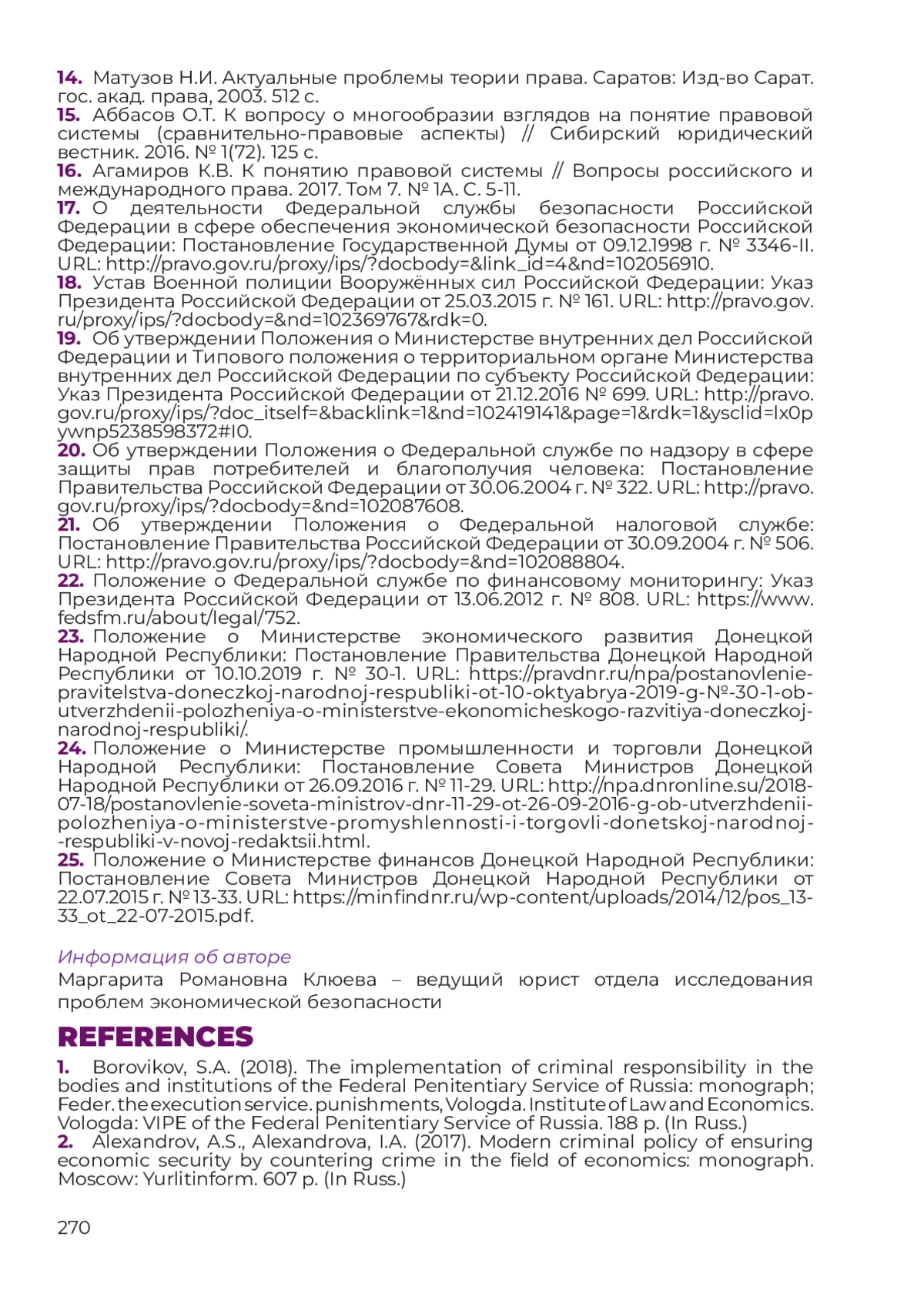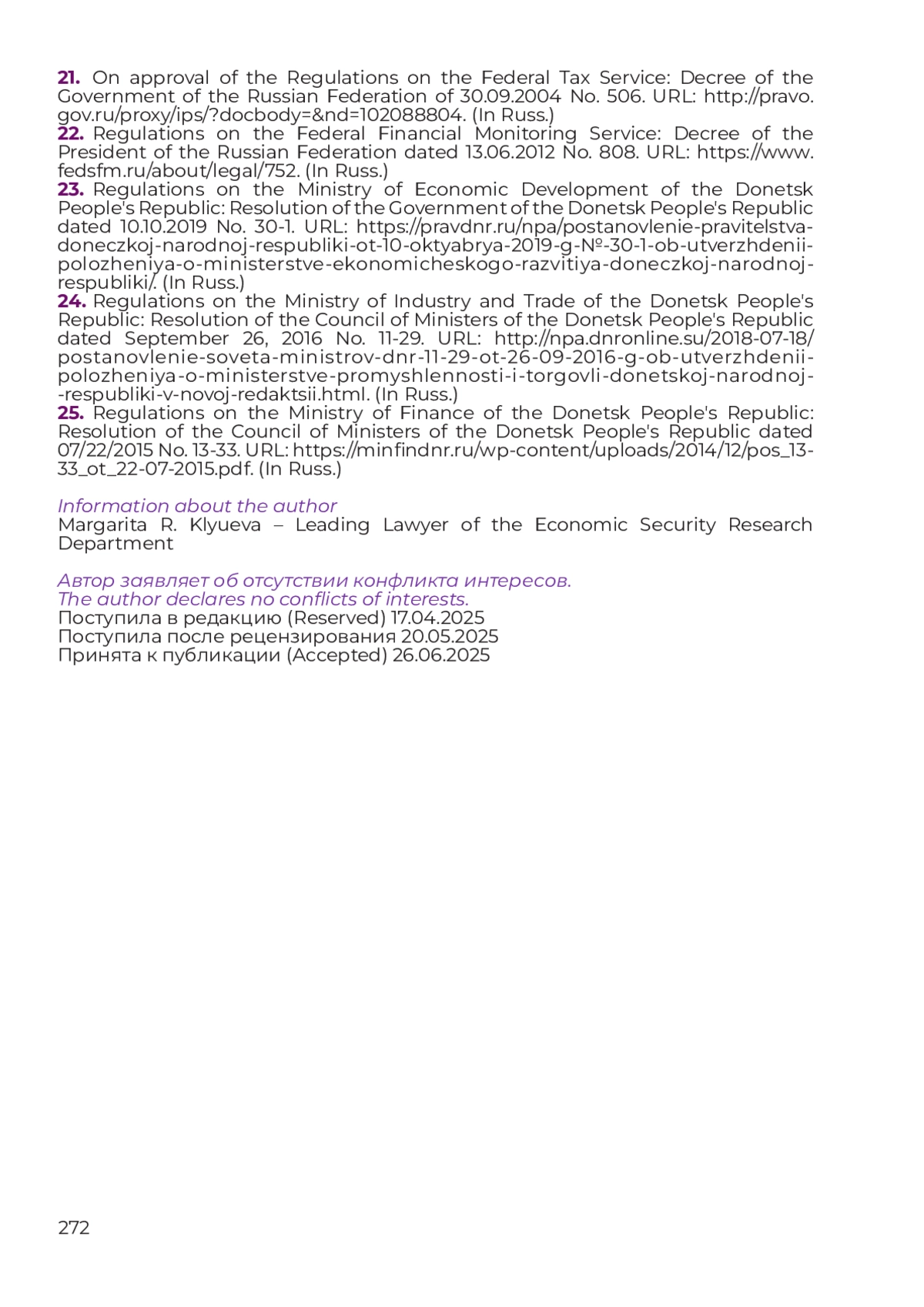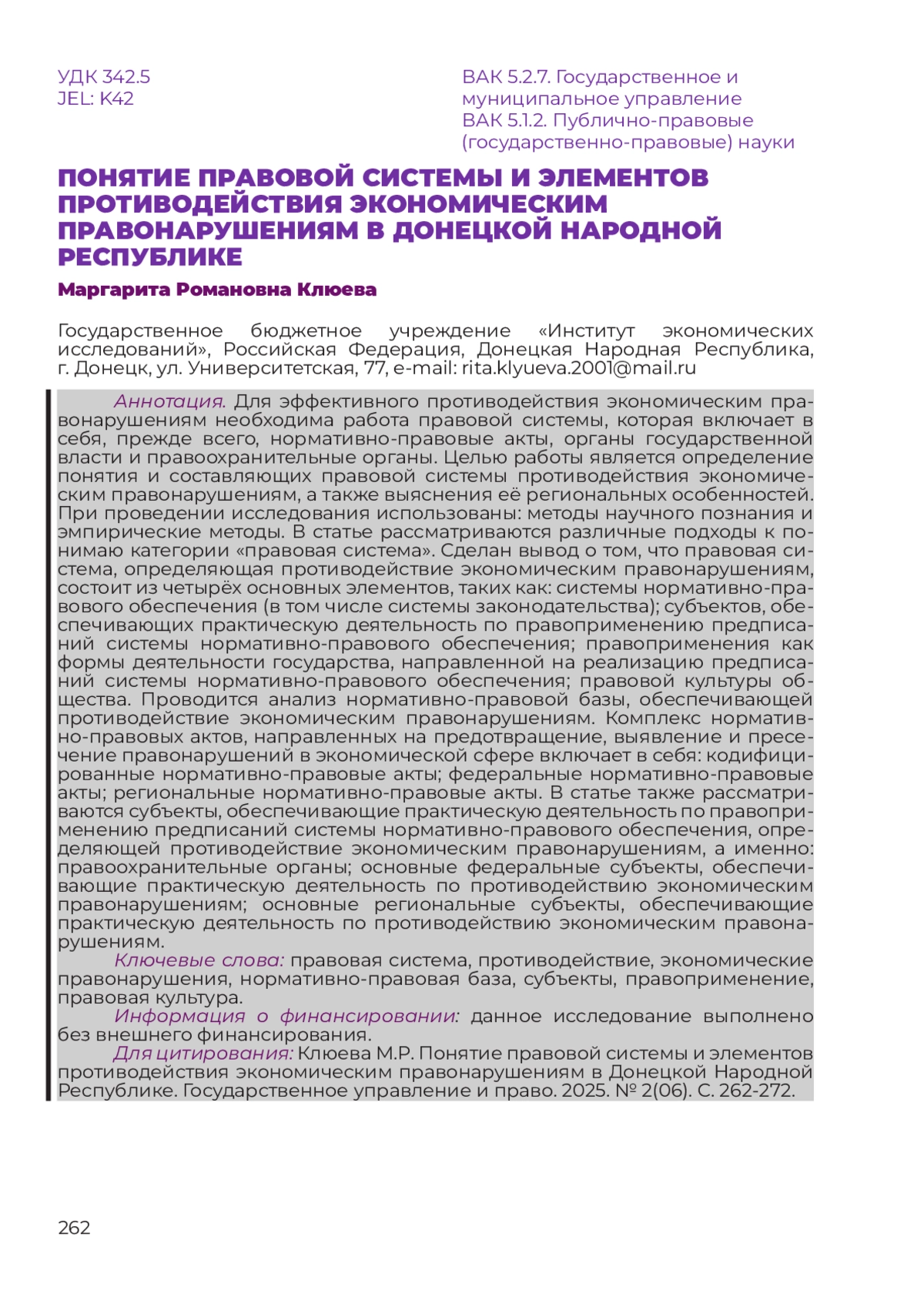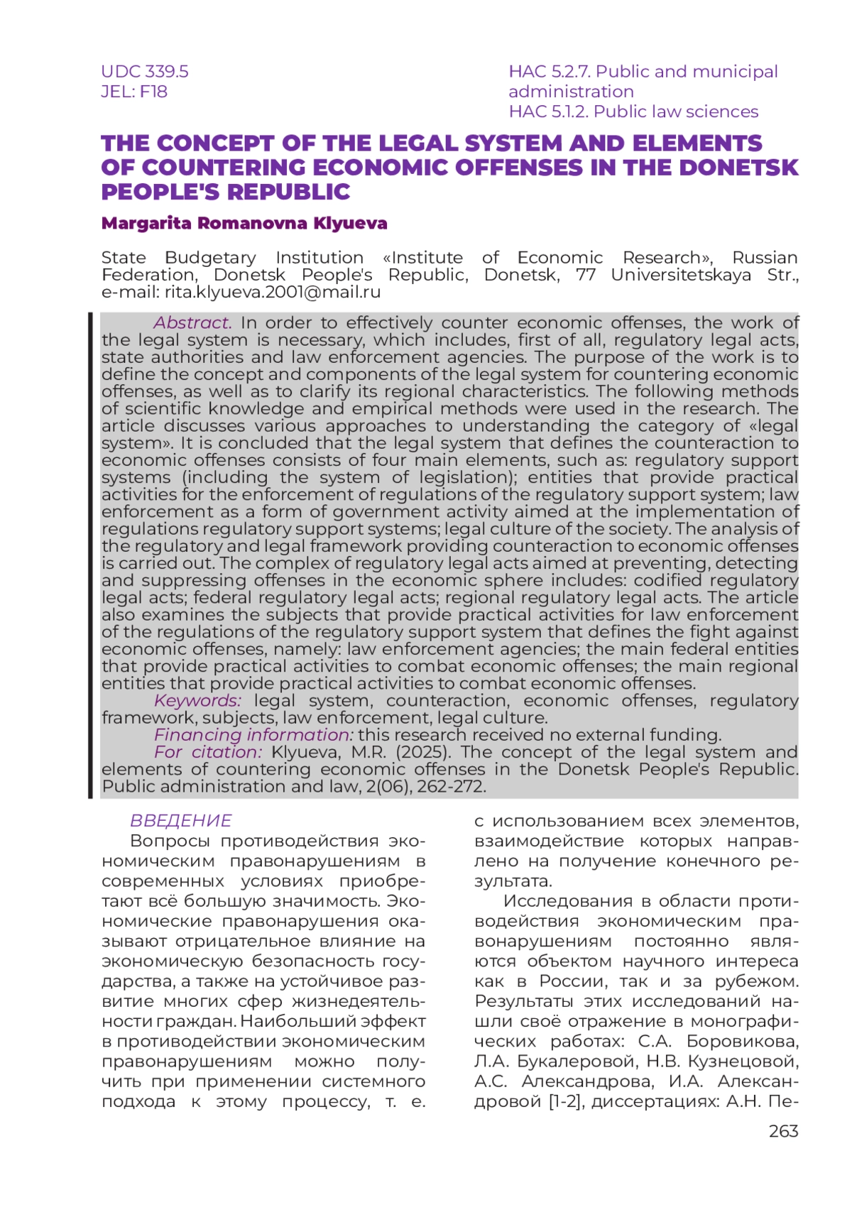 КЛЮЕВА М. Р. ПОНЯТИЕ ПРАВОВОЙ СИСТЕМЫ И ЭЛЕМЕНТОВ ПРОТИВОДЕЙСТВИЯ ЭКОНОМИЧЕСКИМ ПРАВОНАРУШЕНИЯМ В ДОНЕЦКОЙ НАРОДНОЙ РЕСПУБЛИКЕ // НАУЧНЫЙ ЖУРНАЛ "ГОСУДАРСТВЕННОЕ УПРАВЛЕНИЕ И ПРАВО". 2025. № 2 (6)