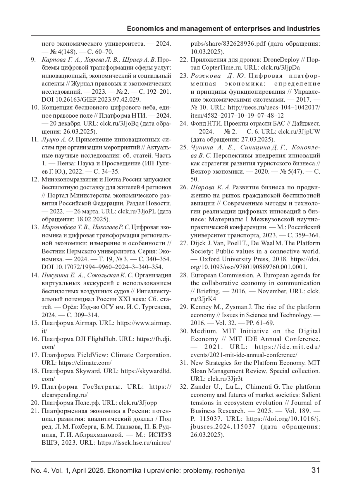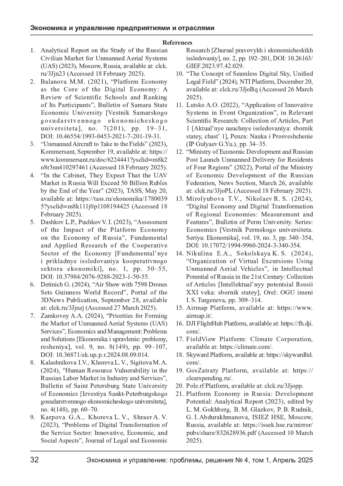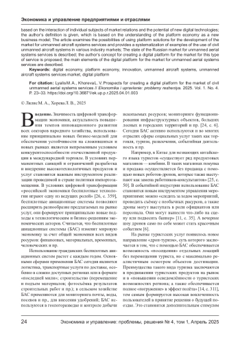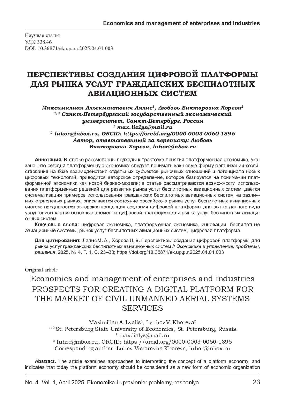 ЛЯЛИС М. А., ХОРЕВА Л. В. ПЕРСПЕКТИВЫ СОЗДАНИЯ ЦИФРОВОЙ ПЛАТФОРМЫ ДЛЯ РЫНКА УСЛУГ ГРАЖДАНСКИХ БЕСПИЛОТНЫХ АВИАЦИОННЫХ СИСТЕМ // ЭКОНОМИКА И УПРАВЛЕНИЕ: ПРОБЛЕМЫ, РЕШЕНИЯ. 2025. ТОМ 1 № 4