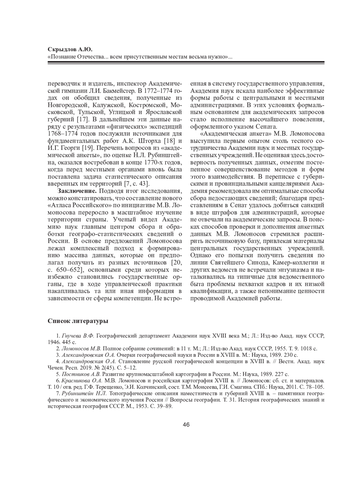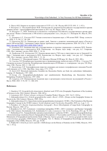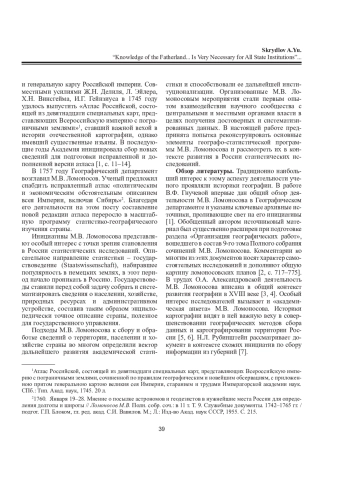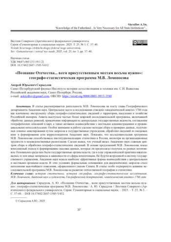 СКРЫДЛОВ А. Ю. «ПОЗНАНИЕ ОТЕЧЕСТВА... ВСЕМ ПРИСУТСТВЕННЫМ МЕСТАМ ВЕСЬМА НУЖНО»: ГЕОГРАФО-СТАТИСТИЧЕСКАЯ ПРОГРАММА М. В. ЛОМОНОСОВА // ВЕСТНИК СЕВЕРНОГО (АРКТИЧЕСКОГО) ФЕДЕРАЛЬНОГО УНИВЕРСИТЕТА. СЕРИЯ: ГУМАНИТАРНЫЕ И СОЦИАЛЬНЫЕ НАУКИ. 2025. Т. 25 № 3