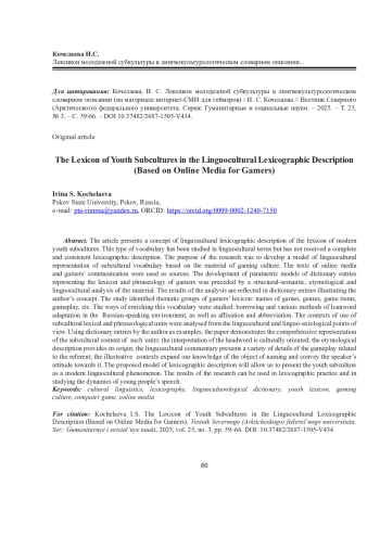 В статье представлена концепция лингвокультурологического словарного описания лексикона современных молодежных субкультур. Лексикон субкультур изучается в лингвокультурологическом плане, но не получает полного и последовательного лексикографического описания. Цель исследования - разработать модель лингвокультурографической репрезентации субкультурного лексикона на примере сферы компьютерных игр (субкультуры геймеров). Материалом исследования выступают тексты интернет-СМИ и образцы коммуникации геймеров на порталах этих изданий. Разработке параметрических моделей словарных статей, репрезентирующих лексику и фразеологию геймеров, предшествовал структурно-семантический, этимологический и лингвокультурологический анализ материала, результаты которого отражены в словарных статьях, иллюстрирующих авторскую концепцию. В исследовании определены тематические группы лексикона геймеров: наименования игр, жанров, игровых предметов, игрового процесса и т. д. Рассмотрены способы пополнения языка субкультуры: заимствование с различными способами адаптации заимствований в русскоязычной среде, аффиксальное словообразование, аббревиация; с лингвокультурологической и лингвоаксиологической точек зрения проанализированы контексты употребления субкультурных лексических и фразеологических единиц. На примерах разработанных автором словарных статей показана комплексная репрезентация субкультурного содержания таких единиц: толкование заголовочного слова или фразеологизма культурологически ориентировано; этимологическая справка раскрывает его происхождение; лингвокультурологический комментарий демонстрирует различные детали игрового процесса, связанные с обозначаемым объектом; иллюстративные контексты расширяют понимание объекта номинации и передают его оценку говорящим. Предлагаемая модель словарного описания позволяет представить молодежную субкультуру как современный лингвокультурологический феномен. Результаты исследования могут быть использованы в лексикографической практике и при изучении динамики речи молодежи.