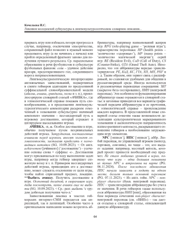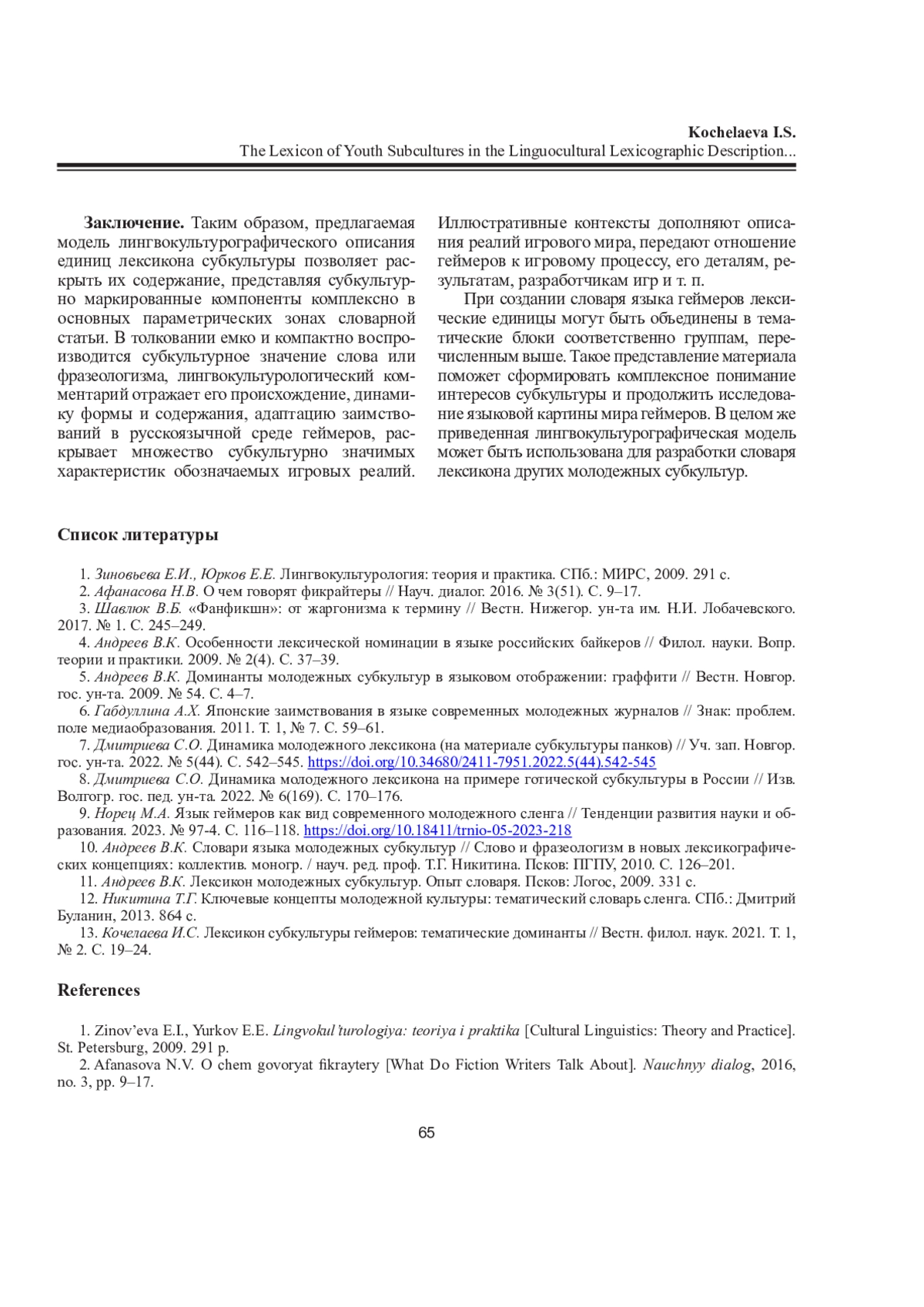 13. Кочелаева И.С. Лексикон субкультуры геймеров: тематические доминанты // Вестн. филол. наук. 2021. Т. 1, № 2. С. 19-24.
