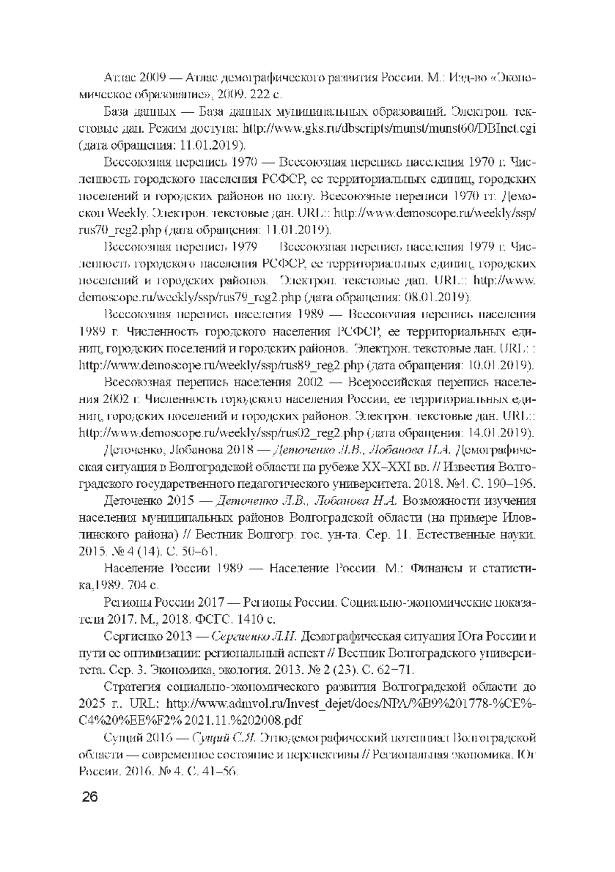 9. Деточенко Л.В., Лобанова Н.А. Демографическая ситуация в Волгоградской области на рубеже XX-XXI вв. // Известия Волгоградского государственного педагогического университета. 2018. №4. С. 190-196.
