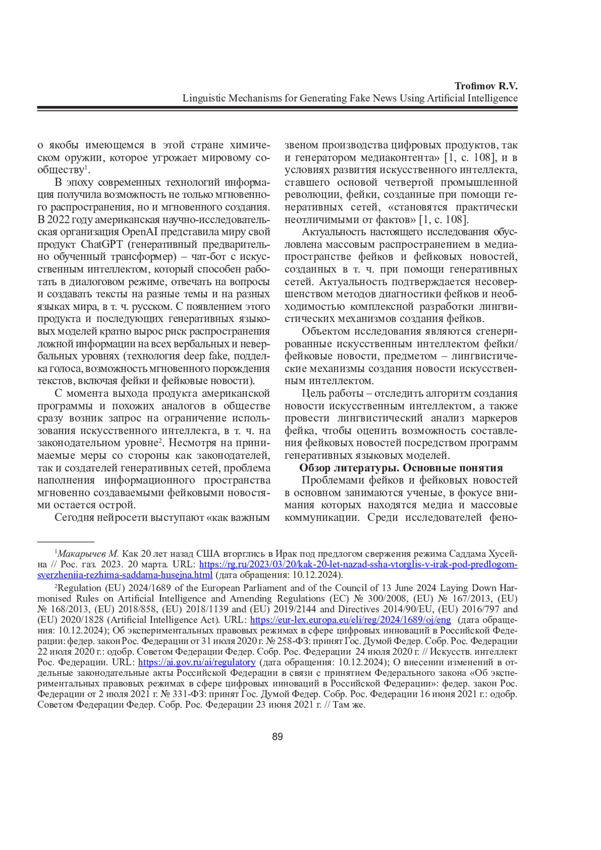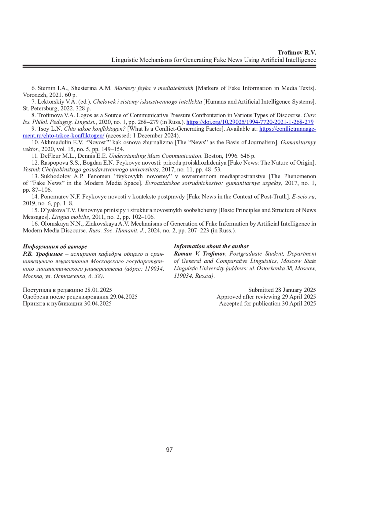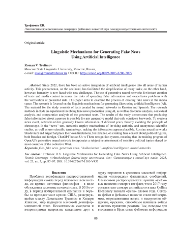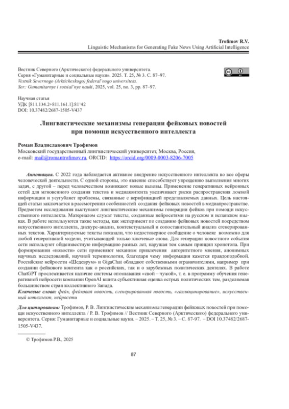 ТРОФИМОВ Р. В. ЛИНГВИСТИЧЕСКИЕ МЕХАНИЗМЫ ГЕНЕРАЦИИ ФЕЙКОВЫХ НОВОСТЕЙ ПРИ ПОМОЩИ ИСКУССТВЕННОГО ИНТЕЛЛЕКТА // ВЕСТНИК СЕВЕРНОГО (АРКТИЧЕСКОГО) ФЕДЕРАЛЬНОГО УНИВЕРСИТЕТА. СЕРИЯ: ГУМАНИТАРНЫЕ И СОЦИАЛЬНЫЕ НАУКИ. 2025. Т. 25 № 3