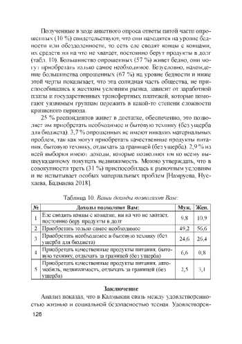 Введение. Под социальной безопасностью понимается защищенность интересов каждой личности и социума от различных вызовов, рисков, угроз, обеспечение важнейших прав человека (на жизнь, на труд и его достойную оплату, на бесплатное лечение и обучение, на доступный отдых, на гарантированную социальную защиту и др.), поддержание условий жизни и деятельности, удовлетворяющих человека. Цель статьи — используя отдельные результаты анкетного опроса сельского населения Республики Калмыкия, проведенного в мае 2019 г. (N=253), рассмотреть: оценку селянами собственного материального положения, факторов, влияющих на его ухудшение или улучшение, мнение об экономической ситуации в республике, степень удовлетворенности сельчан от деятельности социальных учреждений в районе и т. д. Результаты. Проведенное исследование позволило определить пятерку наиболее актуальных социальных проблем сельских территорий республики: низкий уровень оплаты труда (ранг 1), безработица (2), пьянство (3), миграция молодежи, одиночество стариков (4), отсутствие селообразующего предприятия (5). Результаты опроса показывают сильную поляризацию сельского сообщества. Большинство (67 %) респондентов социально не защищены, в силу сложного материального положения им недоступны оптимальные или достойные условия жизни.