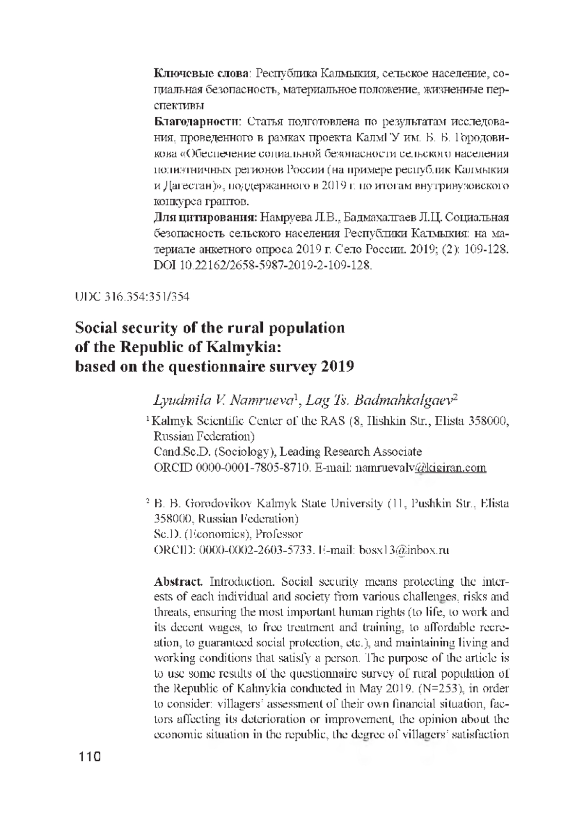 7. Намруева Л. В., Нусхаева Б. Б., Бадмаева Н. В. Развитие сельских территорий Юга России: комплексный анализ социально-экономических процессов. Научный отчет. Элиста: КалмНЦ РАН, 2018. 292 с.