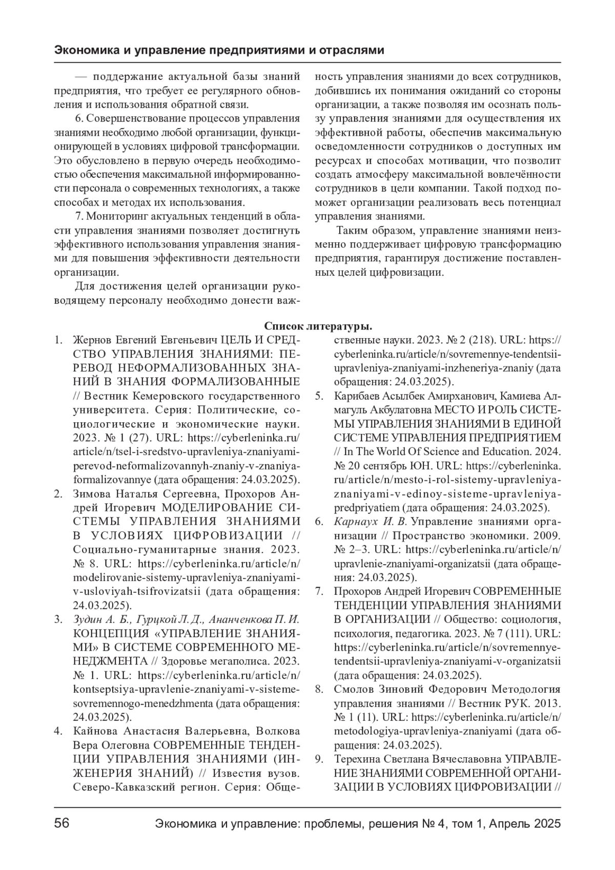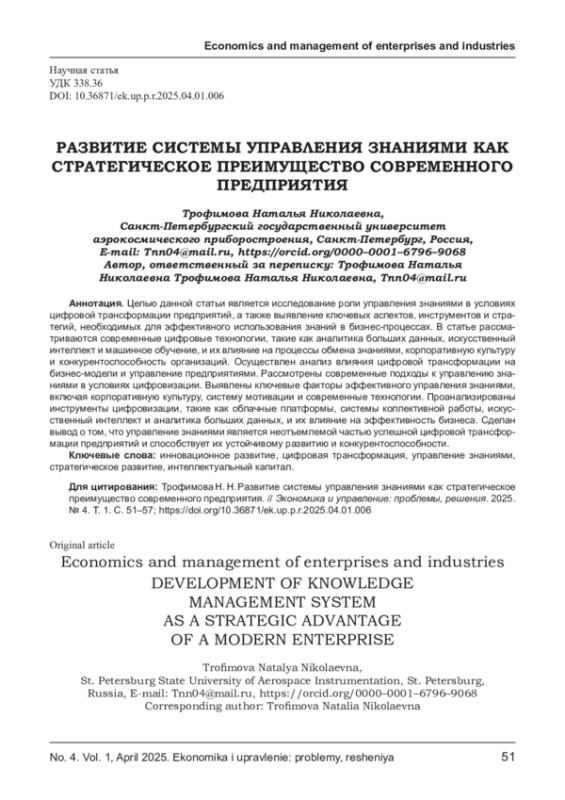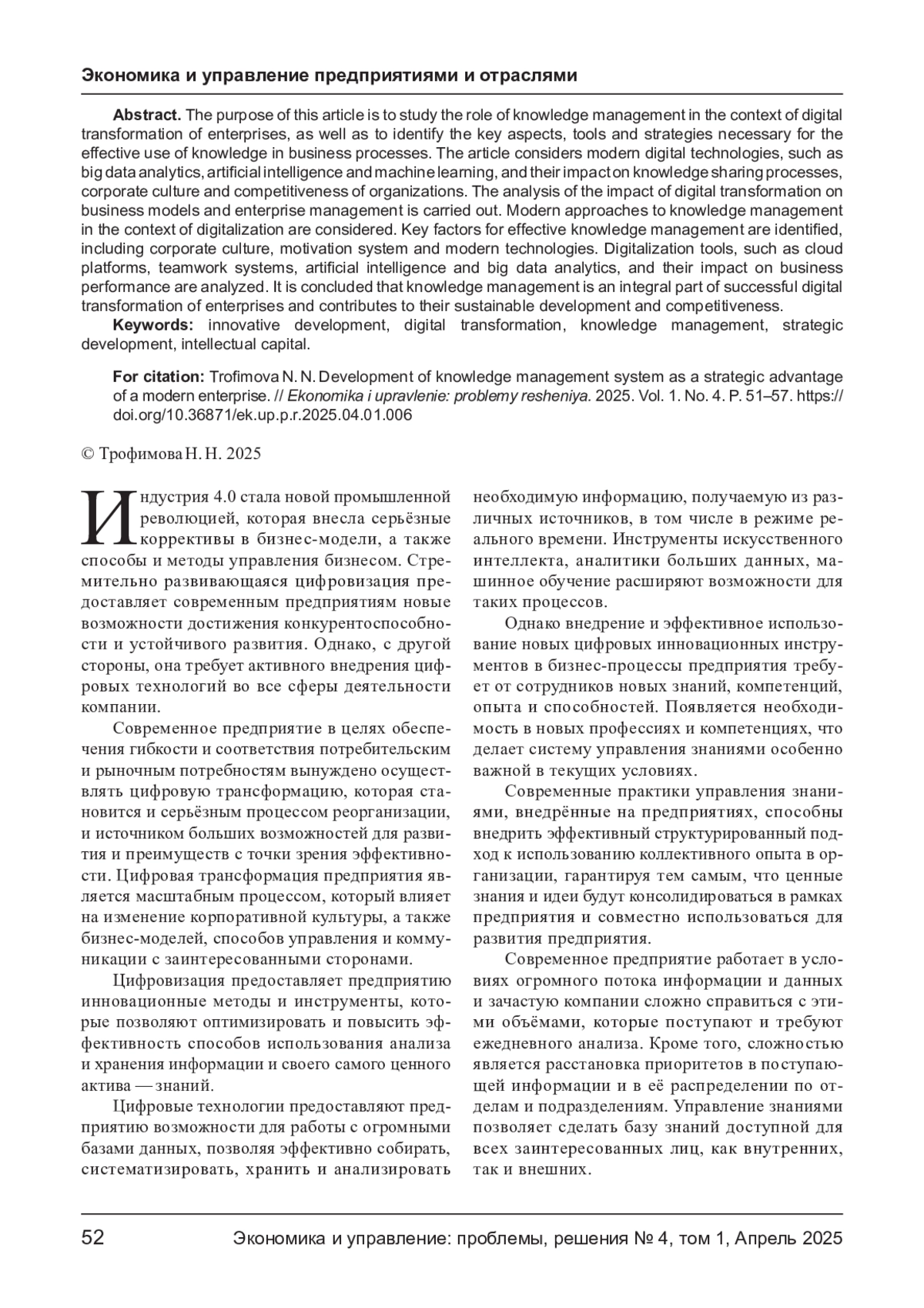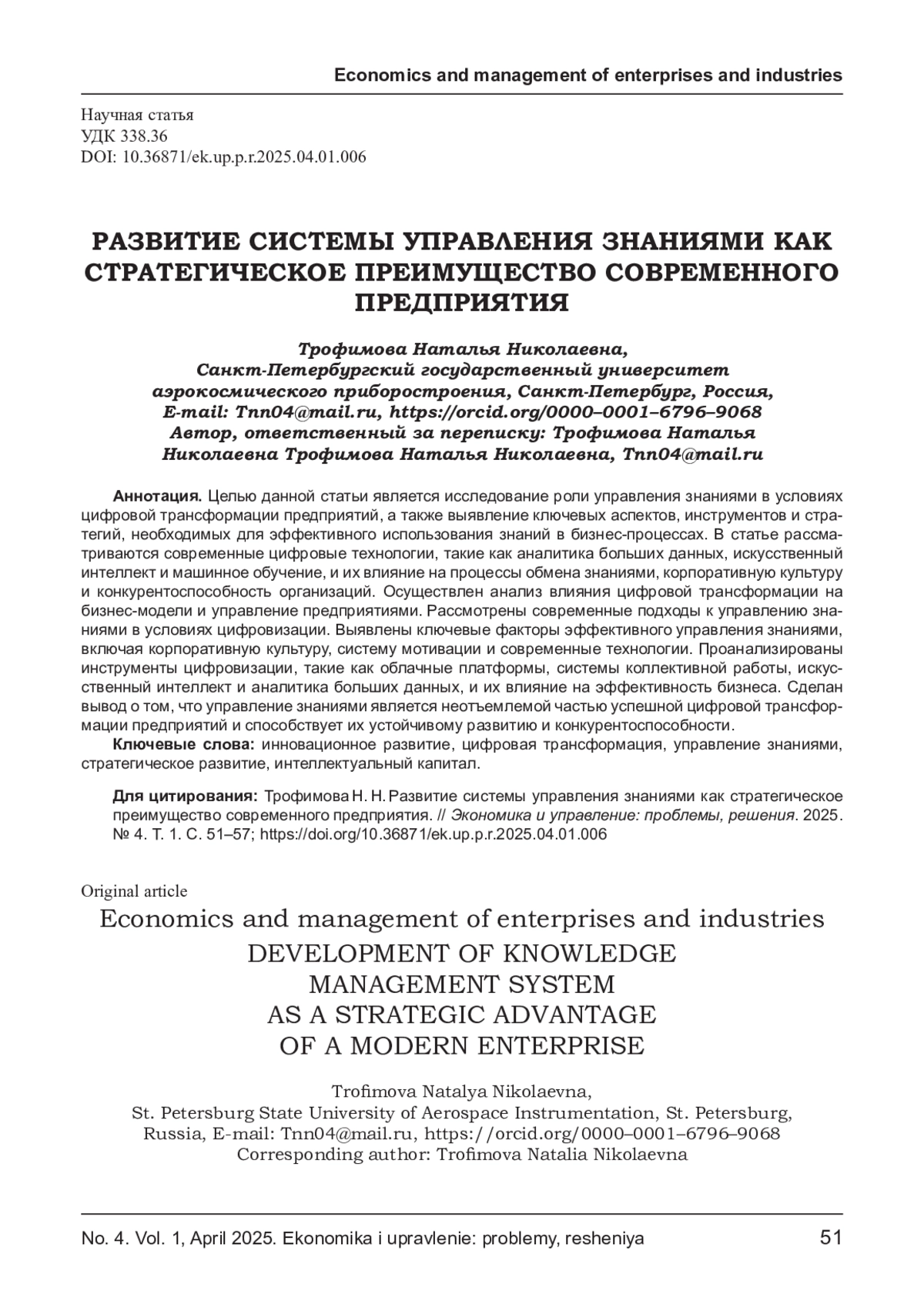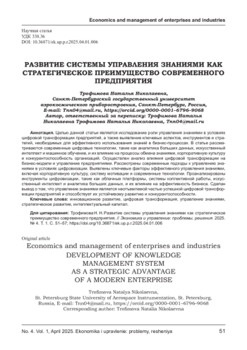 ТРОФИМОВА Н. Н. РАЗВИТИЕ СИСТЕМЫ УПРАВЛЕНИЯ ЗНАНИЯМИ КАК СТРАТЕГИЧЕСКОЕ ПРЕИМУЩЕСТВО СОВРЕМЕННОГО ПРЕДПРИЯТИЯ // ЭКОНОМИКА И УПРАВЛЕНИЕ: ПРОБЛЕМЫ, РЕШЕНИЯ. 2025. ТОМ 1 № 4