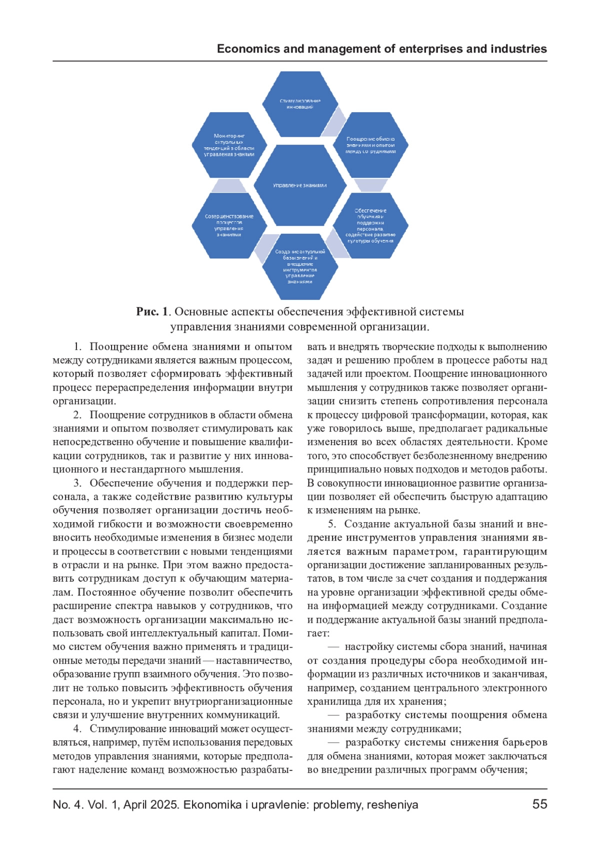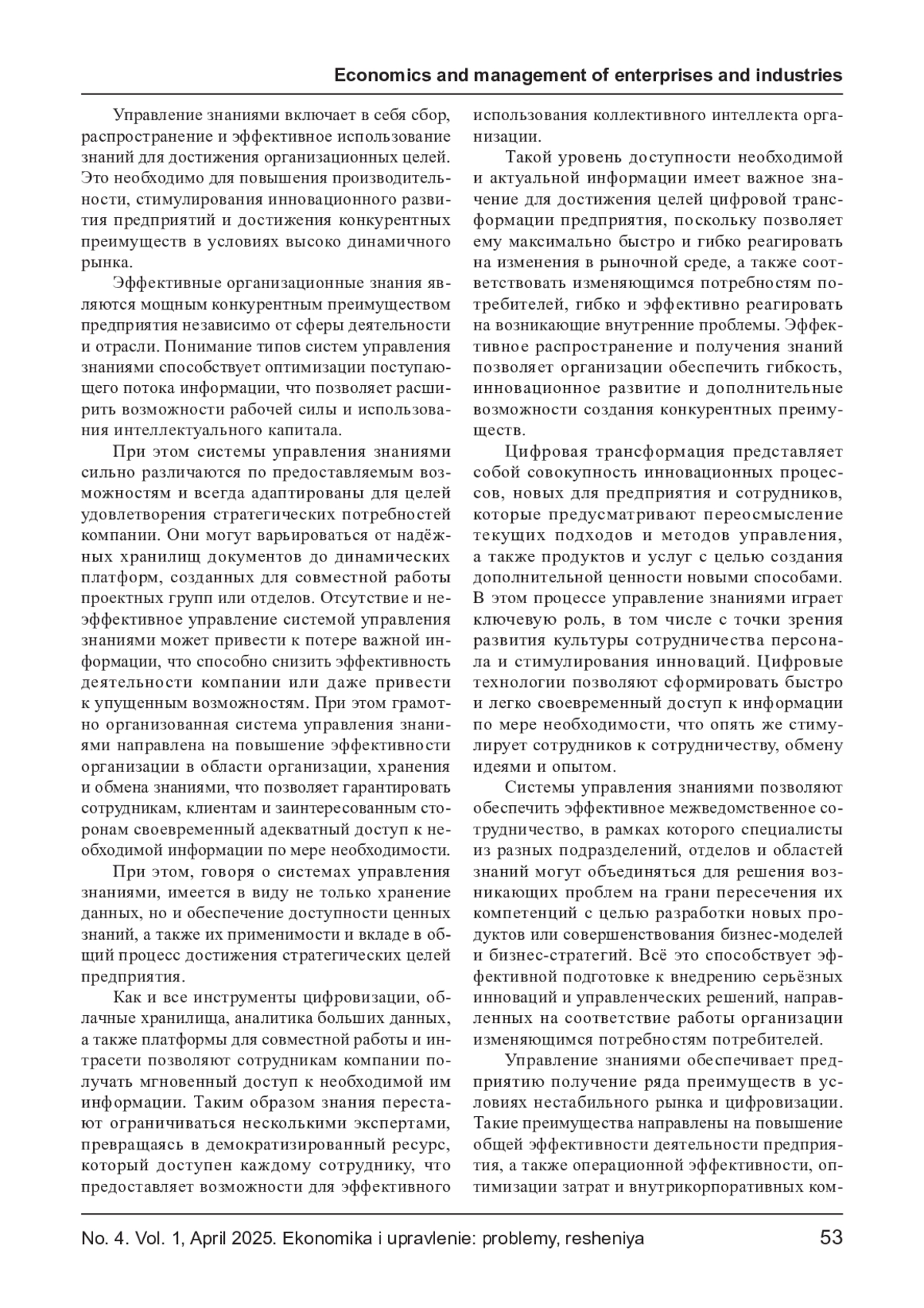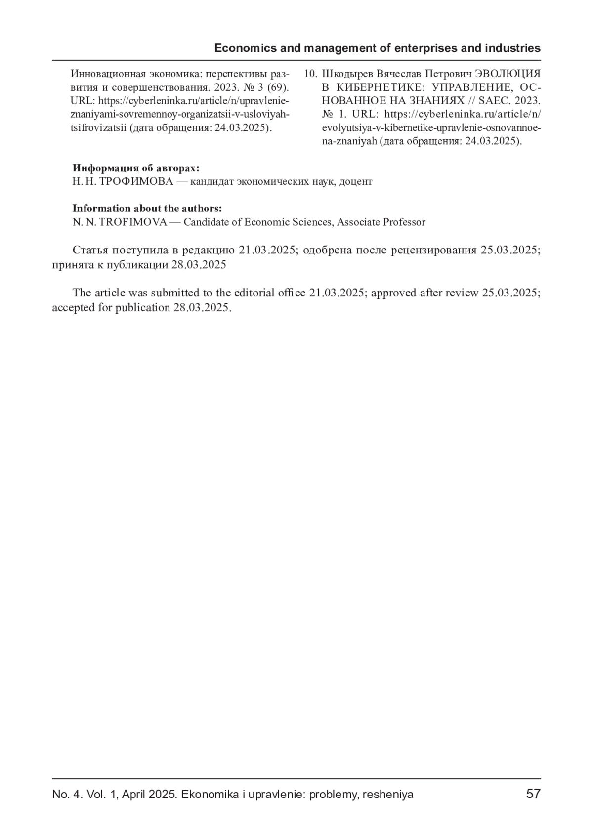 ТРОФИМОВА Н. Н. РАЗВИТИЕ СИСТЕМЫ УПРАВЛЕНИЯ ЗНАНИЯМИ КАК СТРАТЕГИЧЕСКОЕ ПРЕИМУЩЕСТВО СОВРЕМЕННОГО ПРЕДПРИЯТИЯ // ЭКОНОМИКА И УПРАВЛЕНИЕ: ПРОБЛЕМЫ, РЕШЕНИЯ. 2025. ТОМ 1 № 4