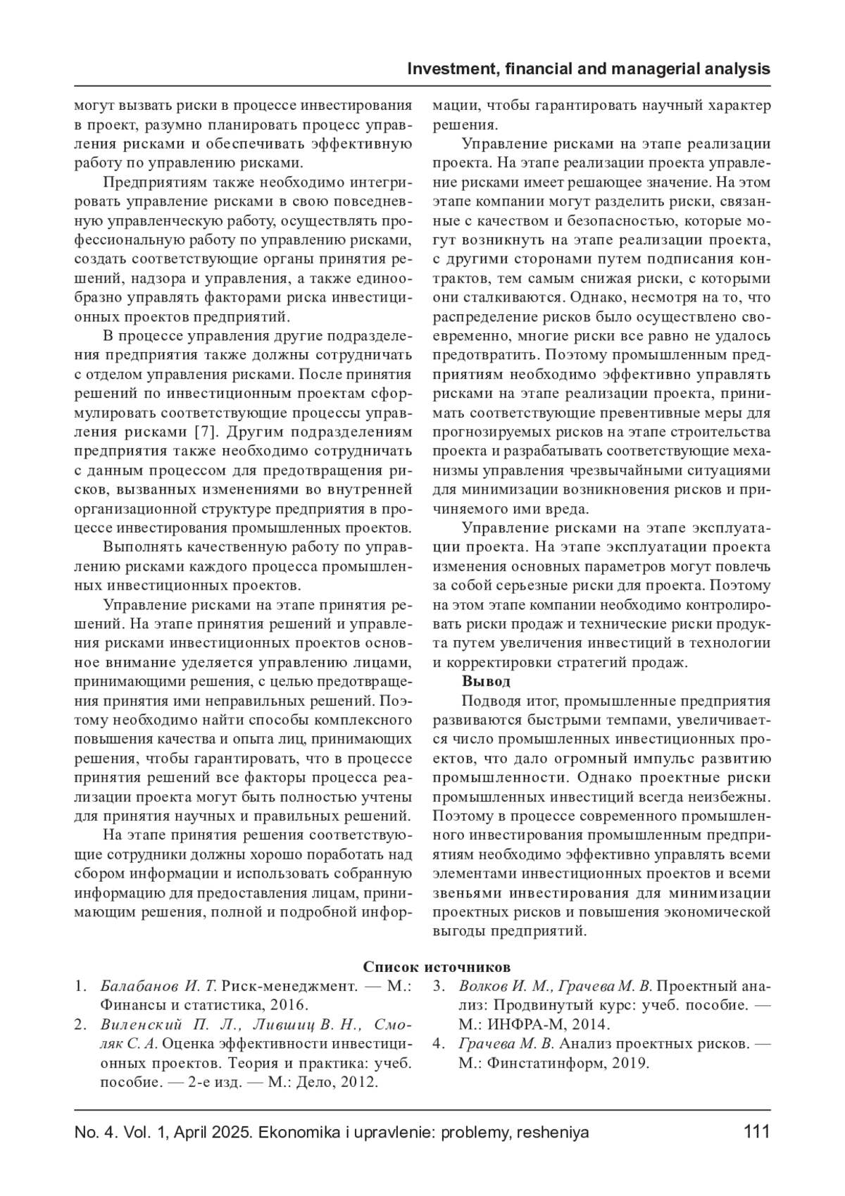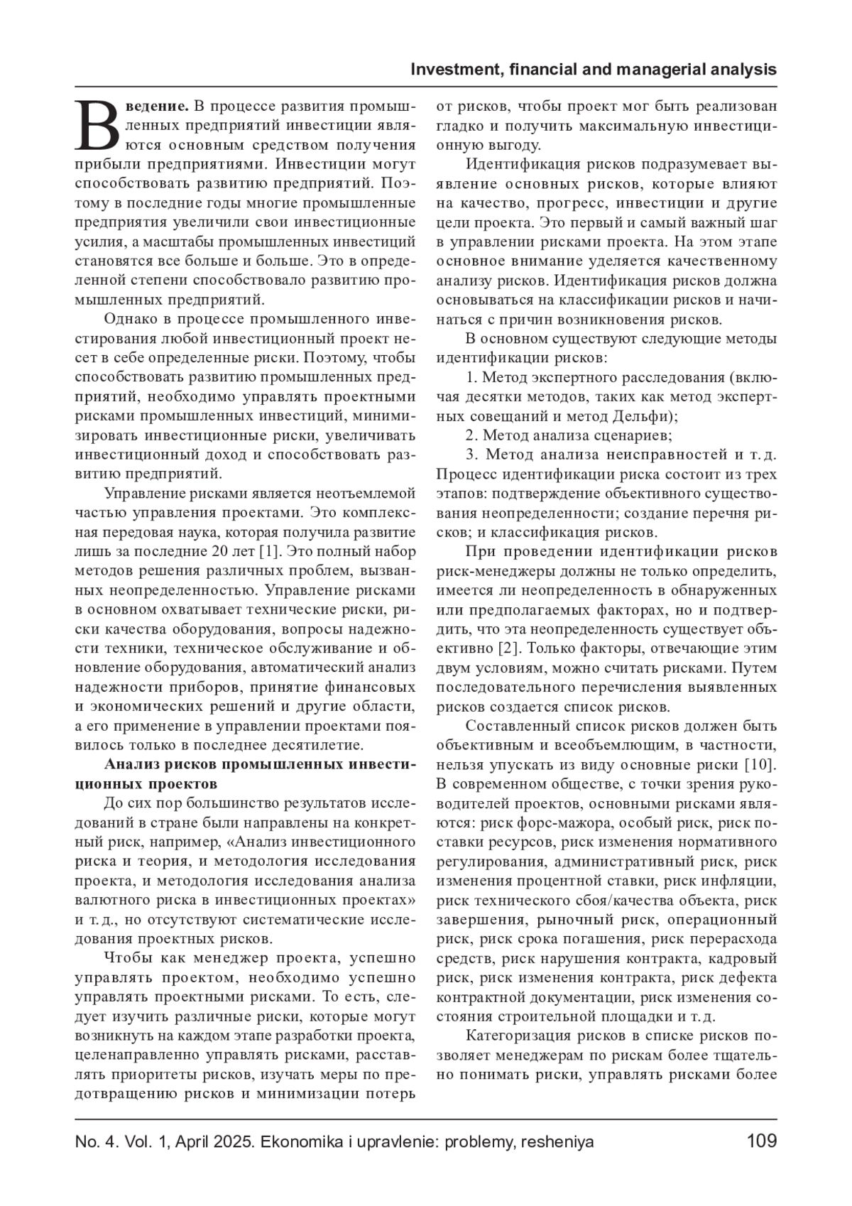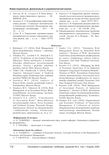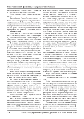 ТАЗБИЕВА А. А., УМАЕВА С. Т. АНАЛИЗ РИСКОВ ПРОМЫШЛЕННЫХ ИНВЕСТИЦИОННЫХ ПРОЕКТОВ // ЭКОНОМИКА И УПРАВЛЕНИЕ: ПРОБЛЕМЫ, РЕШЕНИЯ. 2025. ТОМ 1 № 4