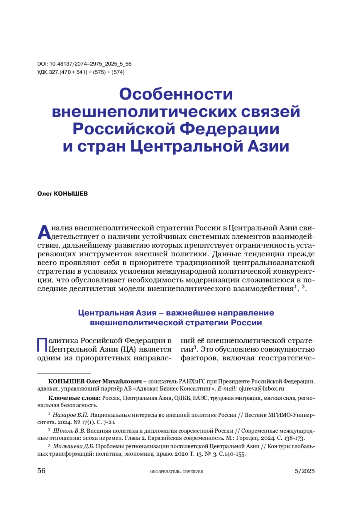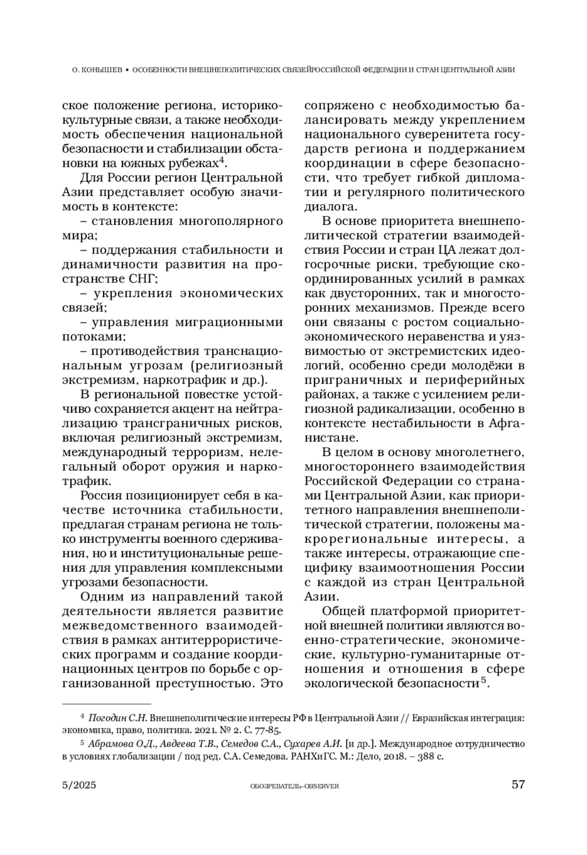 21. Погодин С.Н. Внешнеполитические интересы РФ в Центральной Азии // Евразийская интеграция: экономика, право, политика. 2021. № 2. С. 77-85.