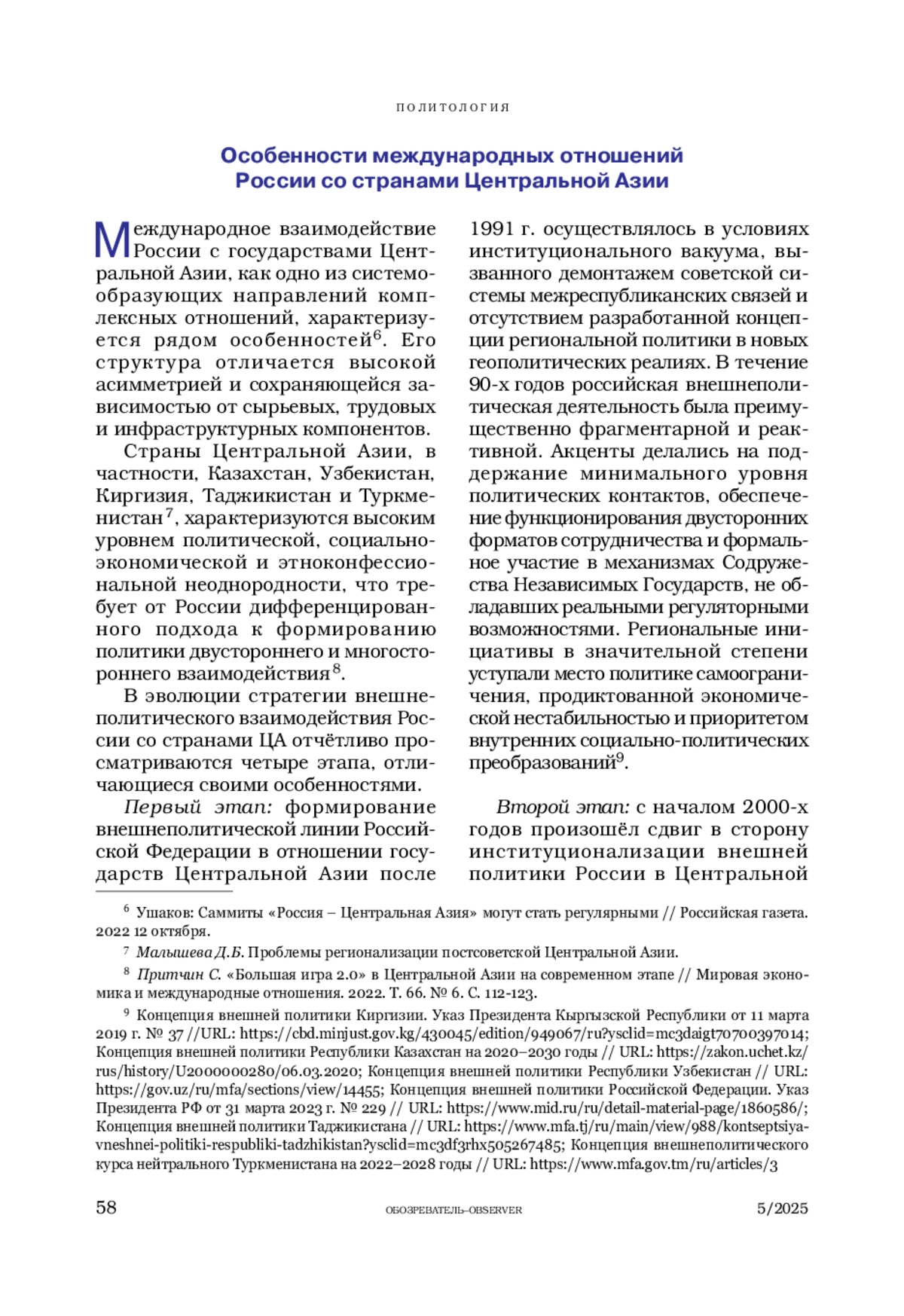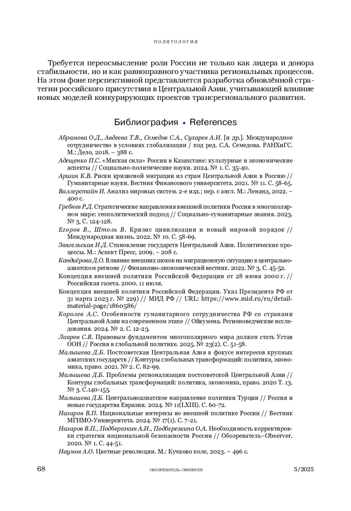15. Малышева Д.Б. Постсоветская Центральная Азия в фокусе интересов крупных азиатских государств // Контуры глобальных трансформаций: политика, экономика, право. 2021. № 2. С. 82-99.