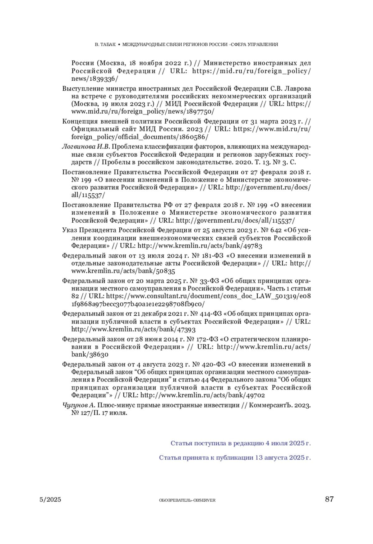 6. Логвинова И.В. Проблема классификации факторов, влияющих на международные связи субъектов Российской Федерации и регионов зарубежных государств // Пробелы в российском законодательстве. 2020. Т. 13. № 3. С.