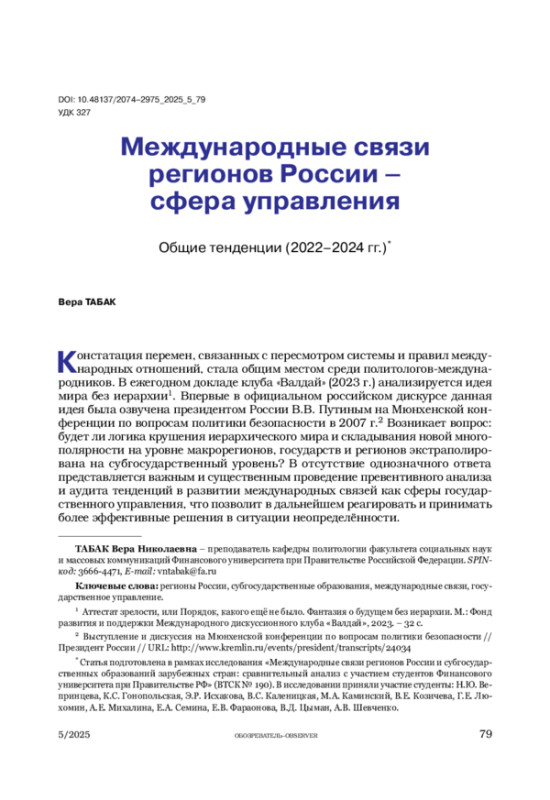 Международная деятельность субгосударственных образований рассматривается как сфера принятия управленческих решений, раскрывается специфика организации международной деятельности субъектов Федерации. Автор пишет о проблемах, связанных с оценкой эффективности международных связей в новых геополитических условиях.