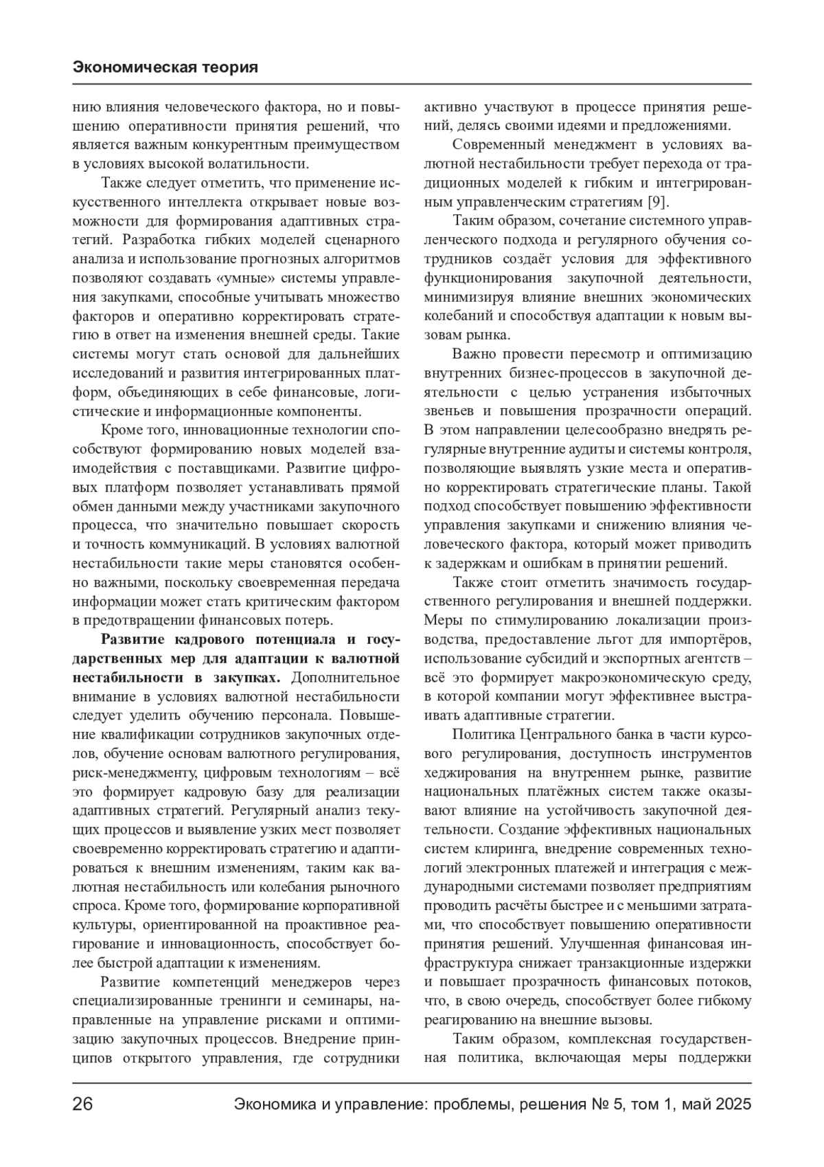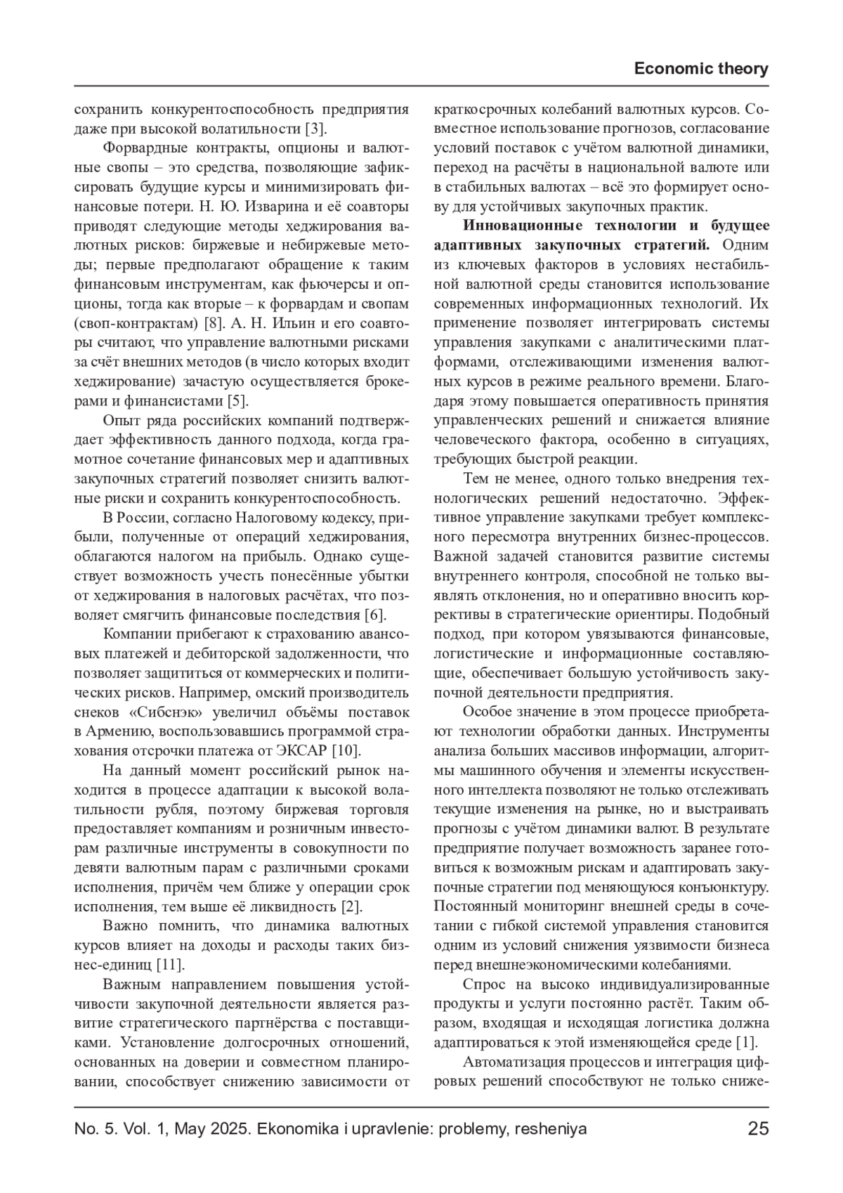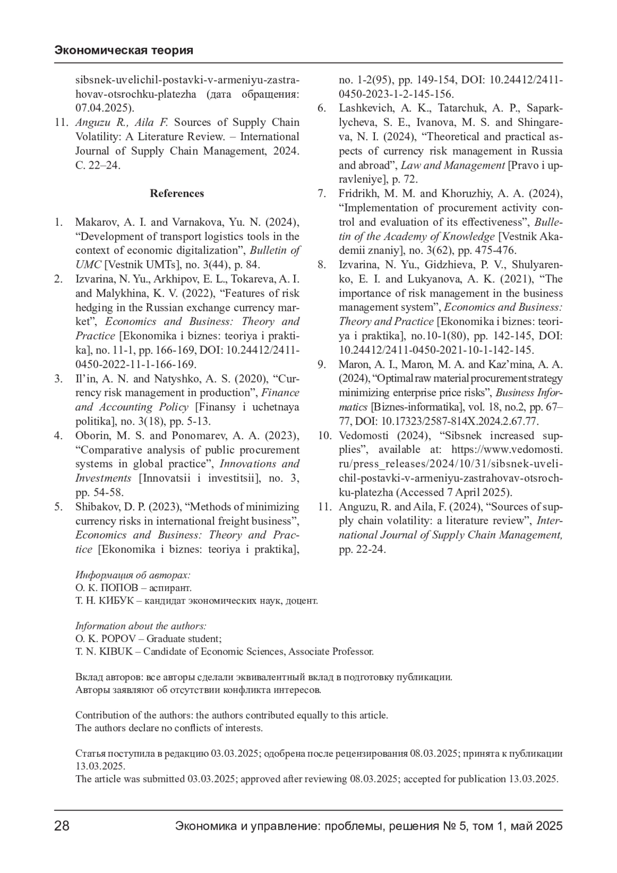 ПОПОВ О. К., КИБУК Т. Н. ФОРМИРОВАНИЕ АДАПТИВНЫХ ЗАКУПОЧНЫХ СТРАТЕГИЙ В УСЛОВИЯХ ВАЛЮТНОЙ НЕСТАБИЛЬНОСТИ: ТЕОРЕТИЧЕСКИЙ АСПЕКТ // ЭКОНОМИКА И УПРАВЛЕНИЕ: ПРОБЛЕМЫ, РЕШЕНИЯ. 2025. ТОМ 1 № 5