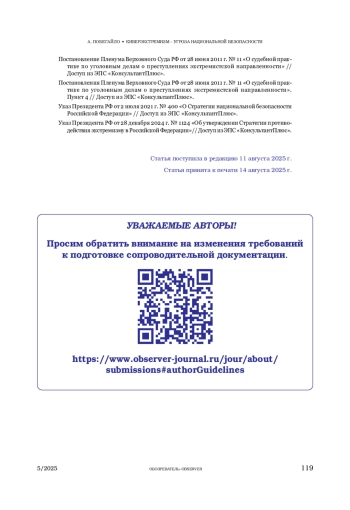 2. Уголовный кодекс РФ от 13 июня 1996 г.№63‑ФЗ // Доступ из ЭПС «КонсультантПлюс». Федерального закона от 25 июля 2002 г. № 114‑ФЗ «О противодействии экстремистской деятельности» // Доступ из ЭПС «КонсультантПлюс».
