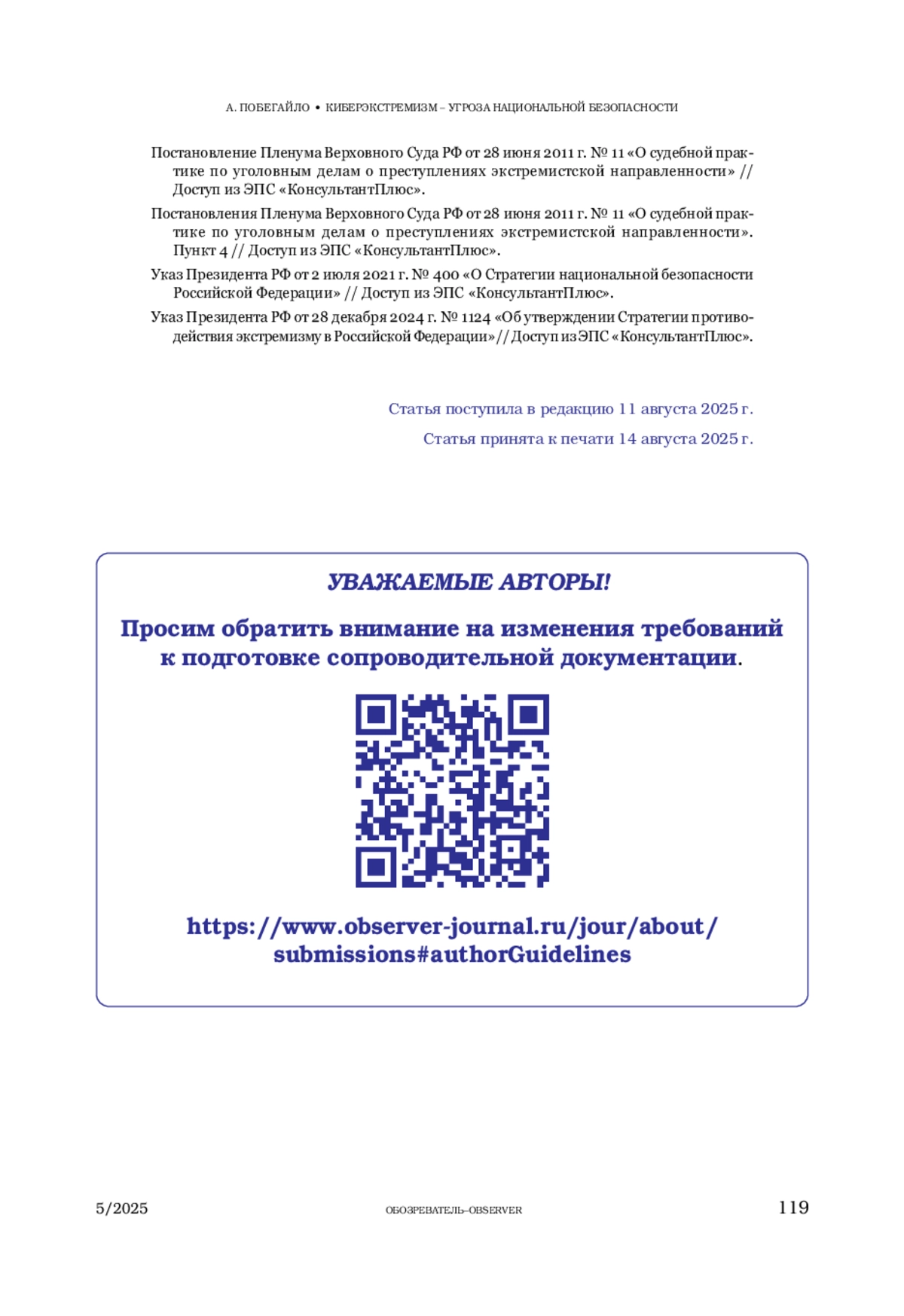3. Постановление Пленума Верховного Суда РФ от 28 июня 2011 г. № 11 «О судебной практике по уголовным делам о преступлениях экстремистской направленности» // Доступ из ЭПС «КонсультантПлюс».