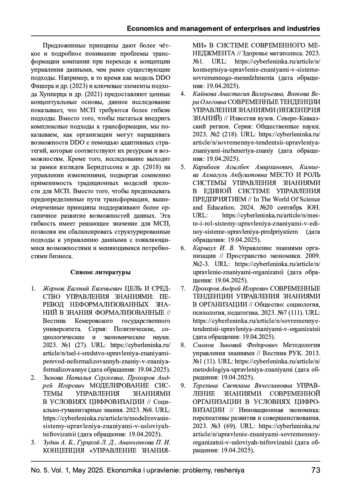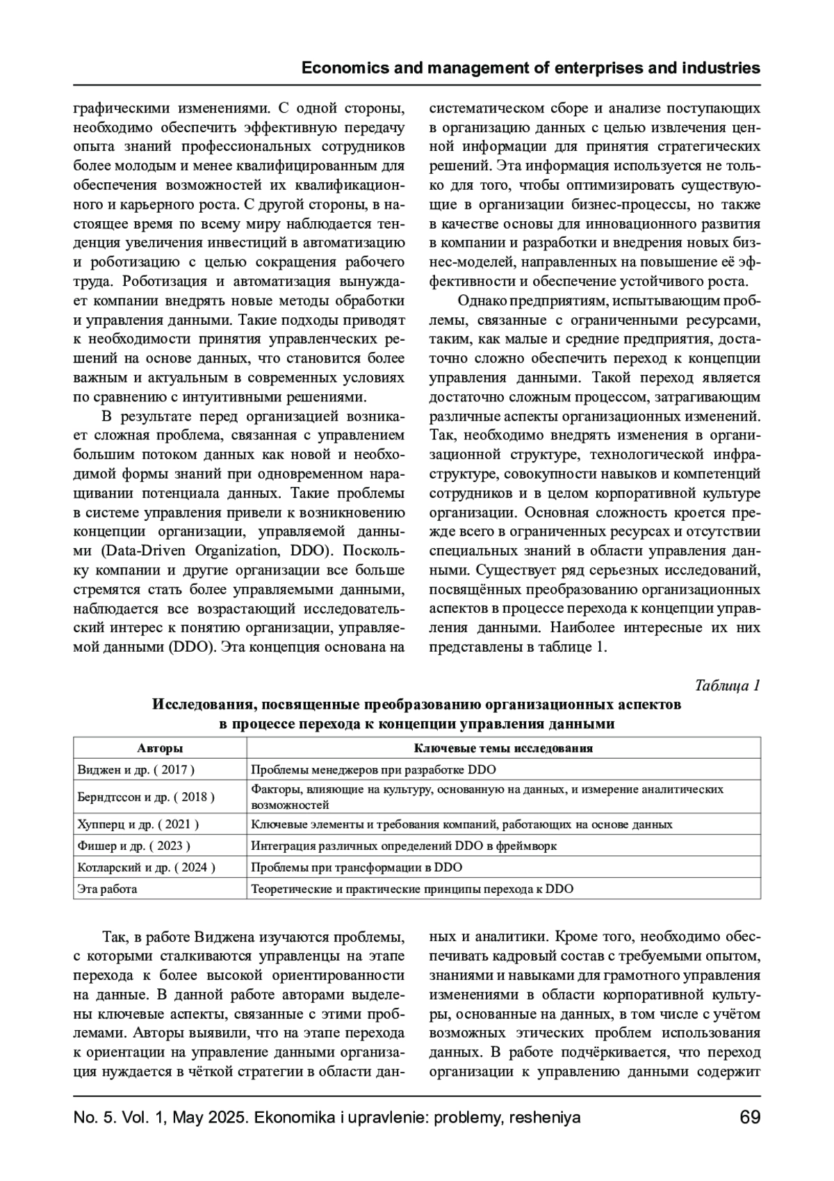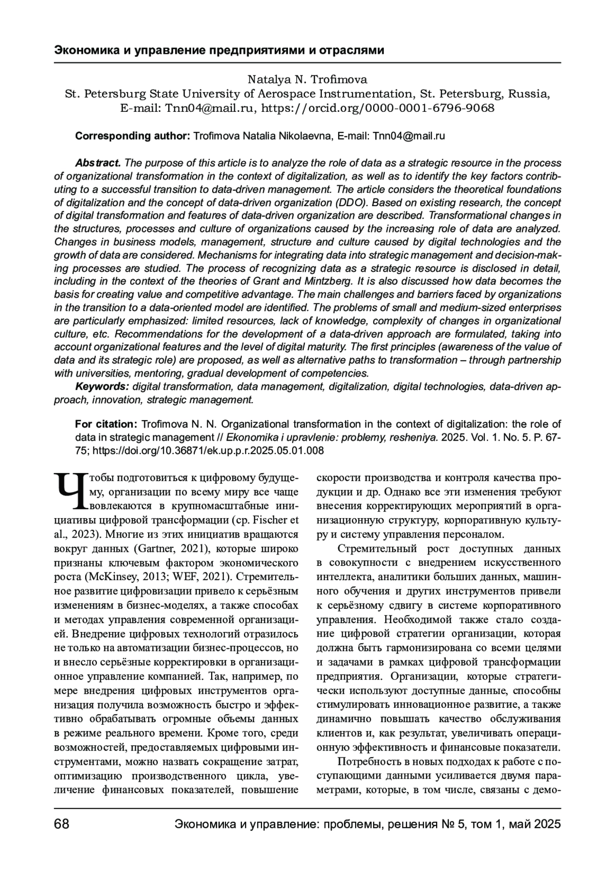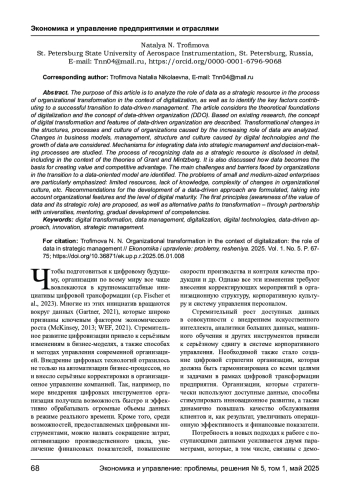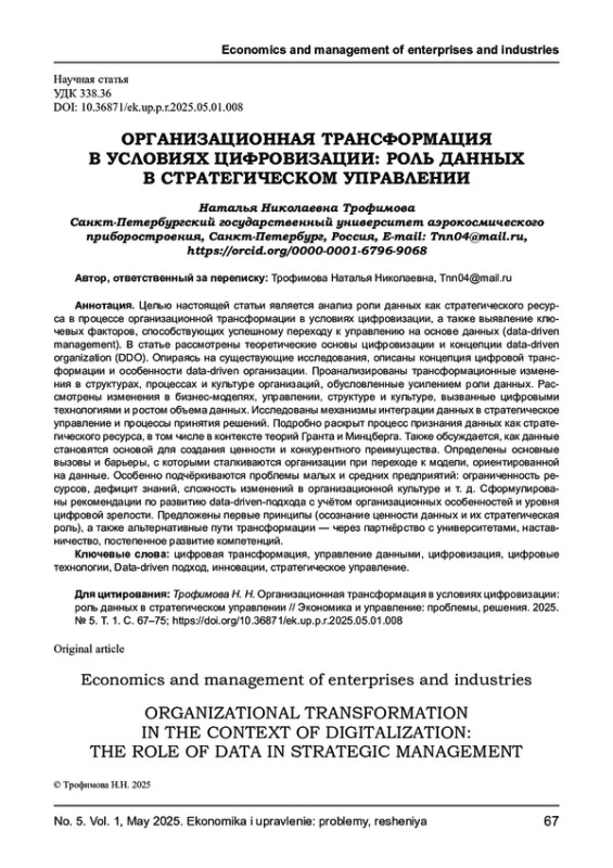 ТРОФИМОВА Н. Н. ОРГАНИЗАЦИОННАЯ ТРАНСФОРМАЦИЯ В УСЛОВИЯХ ЦИФРОВИЗАЦИИ: РОЛЬ ДАННЫХ В СТРАТЕГИЧЕСКОМ УПРАВЛЕНИИ // ЭКОНОМИКА И УПРАВЛЕНИЕ: ПРОБЛЕМЫ, РЕШЕНИЯ. 2025. ТОМ 1 № 5