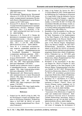 7. Топчи Ю. А. О некоторых методологических вопросах управления развитием малого и среднего предпринимательства в Российской Федерации // Экономика и управление: проблемы, решения. - 2024. - Т. 8, № 4(145). - С. 50-55. DOI: 10.36871/ek.up.p.r.2024.04.08.007 EDN: VORBIC