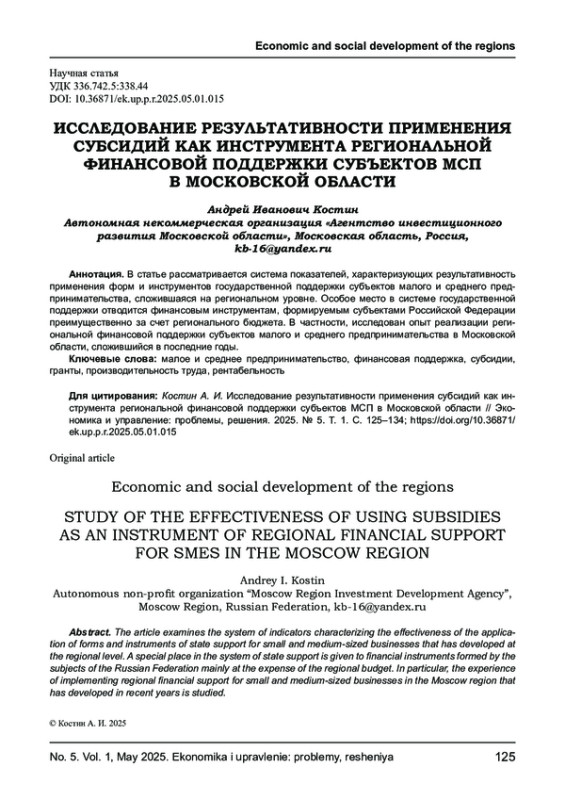 В статье рассматривается система показателей, характеризующих результативность применения форм и инструментов государственной поддержки субъектов малого и среднего предпринимательства, сложившаяся на региональном уровне. Особое место в системе государственной поддержки отводится финансовым инструментам, формируемым субъектами Российской Федерации преимущественно за счет регионального бюджета. В частности, исследован опыт реализации региональной финансовой поддержки субъектов малого и среднего предпринимательства в Московской области, сложившийся в последние годы.