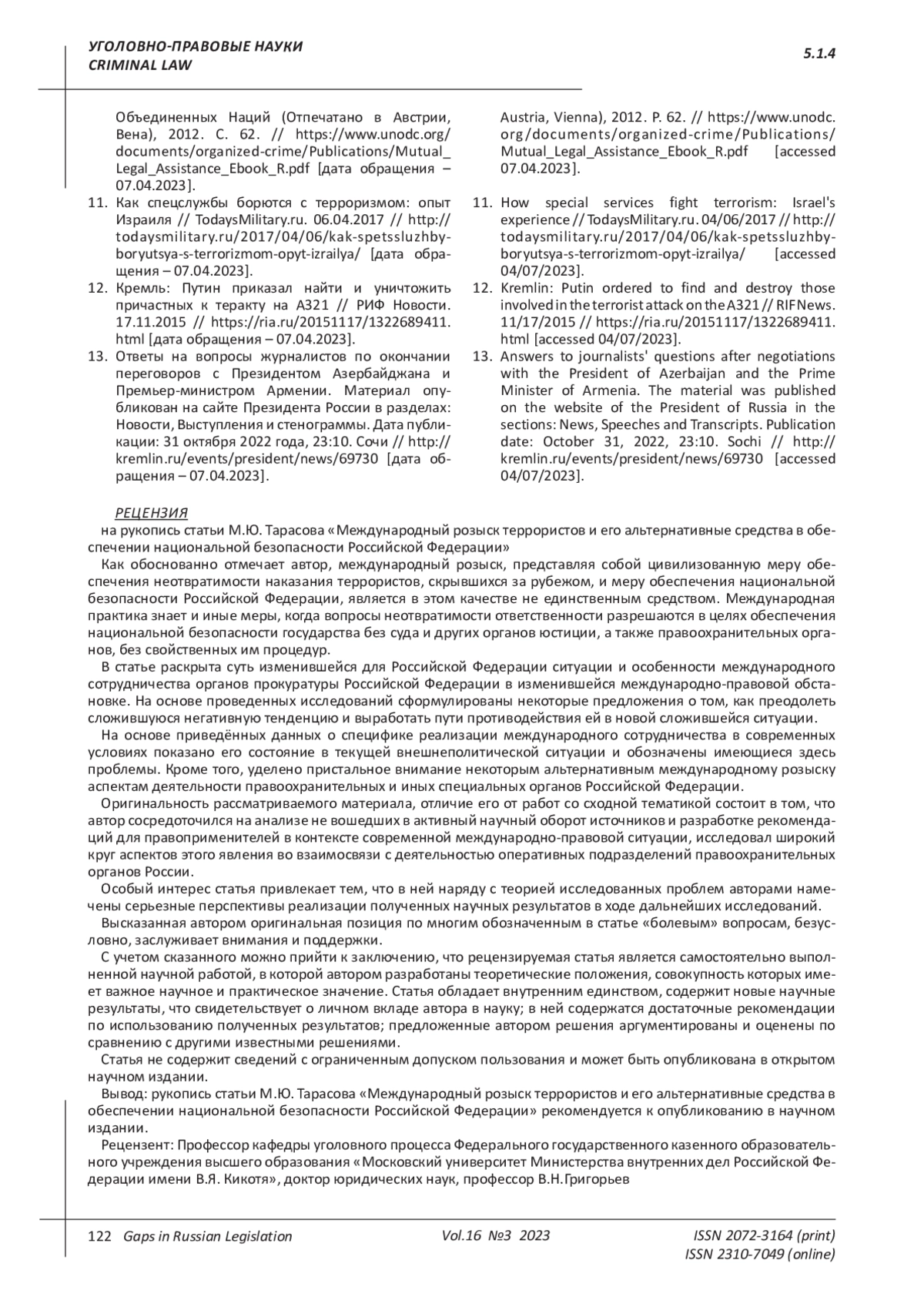 8. Аналитическая справка об итогах работы Главного управления международно-правового сотрудничества в первом полугодии 2022 г. по приоритетным направлениям деятельности и выполнению поручений Генерального прокурора Российской Федерации // Архив Главного управления международно-правового сотрудничества Генеральной прокуратуры Российской Федерации. 2023.