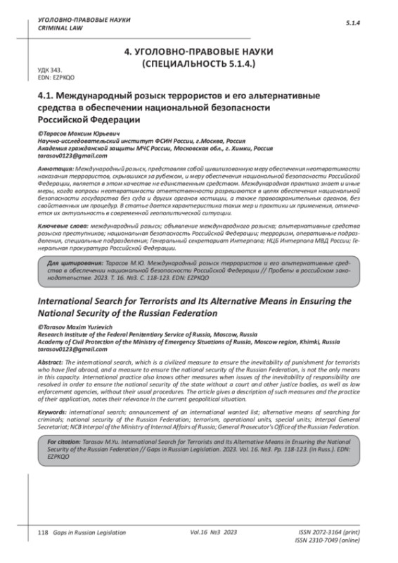 6. Лещенко О.В. Состояние и динамика международного розыска обвиняемых, осужденных и лиц, пропавших без вести // Юристъ-Правоведъ. 2015. № 3 (70). С. 90-93. EDN: UISJOP