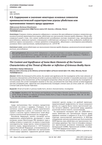 В рамках статьи раскрыто содержание и значение для расследования основных элементов криминалистической характеристики угрозы убийством или причинением тяжкого вреда здоровью. Сделан обоснованный вывод о том, что знание особенностей исследуемого состава позволяет лицу, производящему расследование, правильно оценить сложившуюся следственную ситуацию по делу, выдвинуть наиболее вероятные версии случившегося, а также грамотно спланировать, объективно и всесторонне расследовать уголовные дела о преступлениях, предусмотренных ст. 119 УК РФ.