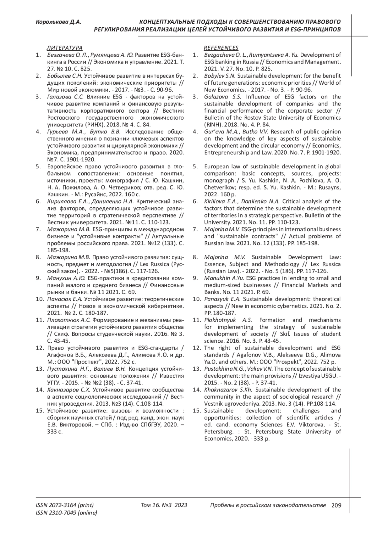 The right of sustainable development and ESG standards / Agafonov V.B., Alekseeva D.G., Alimova Ya.O. and others. M.: OOO “Prospekt”, 2022. 752 p.
