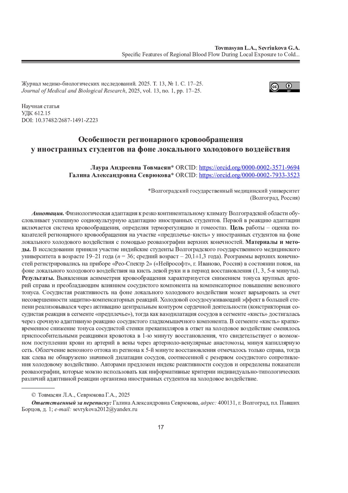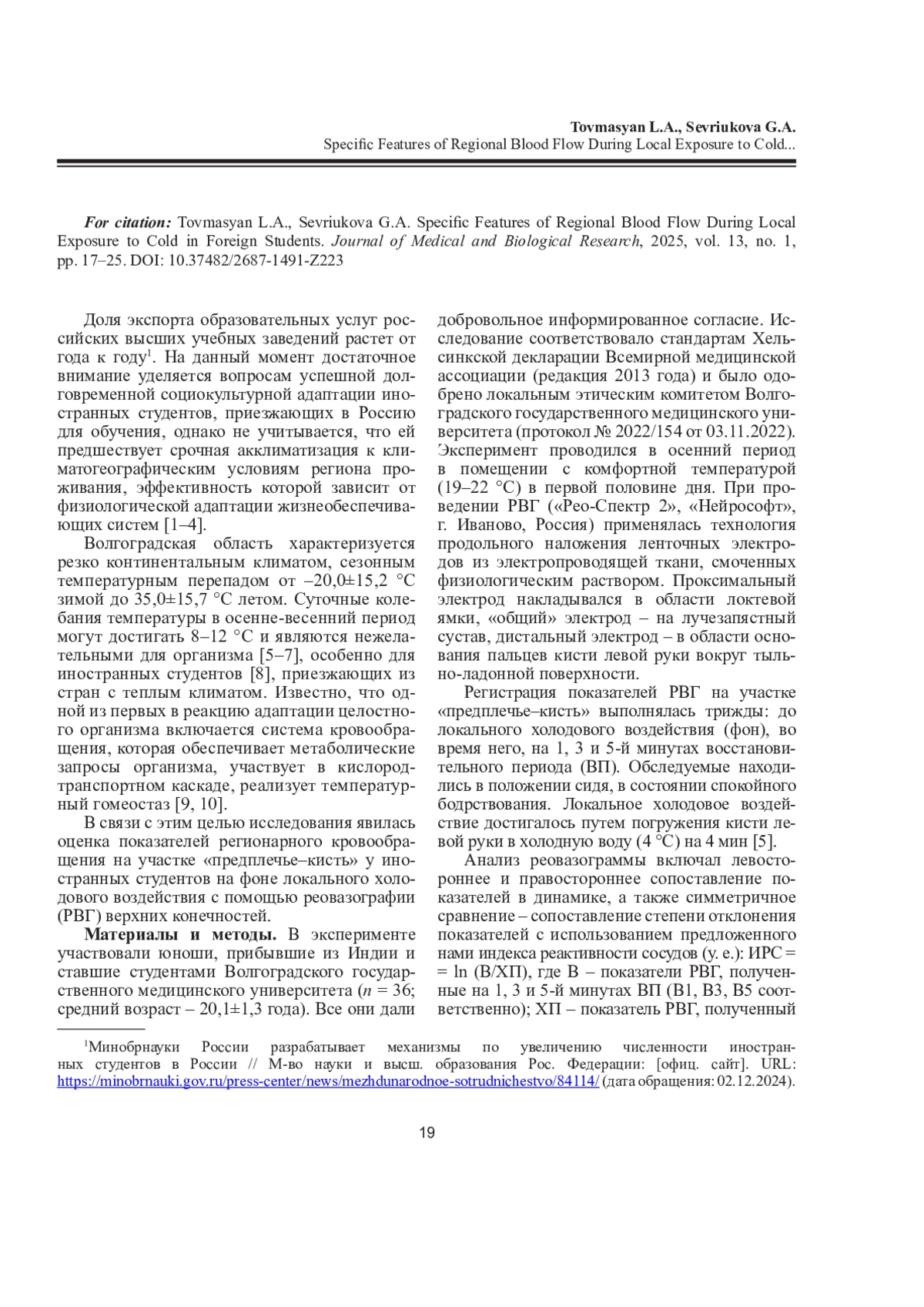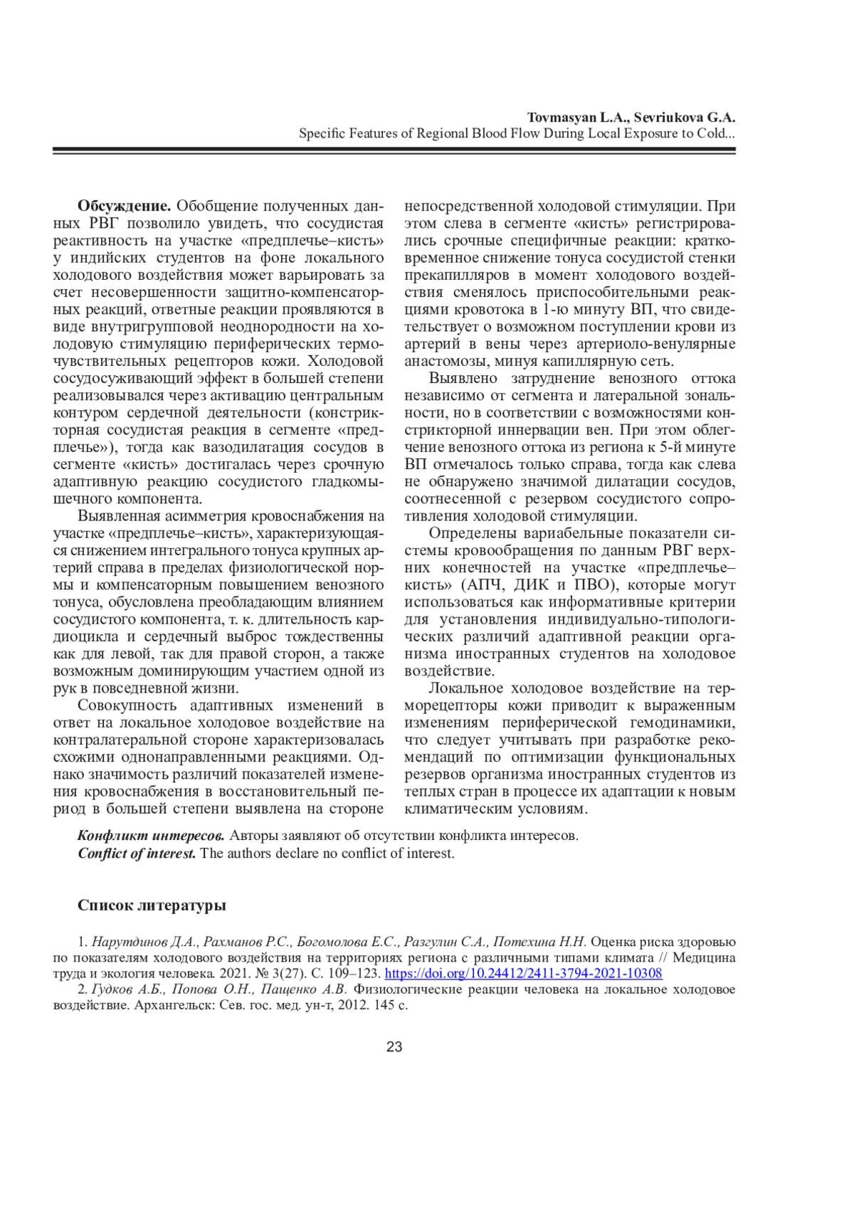 Результаты. Выявленная асимметрия кровообращения характеризуется снижением тонуса крупных артерий справа и преобладающим влиянием сосудистого компонента на компенсаторное повышение венозного тонуса. Сосудистая реактивность на фоне локального холодового воздействия может варьировать за счет несовершенности защитно-компенсаторных реакций. Холодовой сосудосуживающий эффект в большей степени реализовывался через активацию центральным контуром сердечной деятельности (констрикторная сосудистая реакция в сегменте «предплечье»), тогда как вазодилатация сосудов в сегменте «кисть» достигалась через срочную адаптивную реакцию сосудистого гладкомышечного компонента. В сегменте «кисть» кратковременное снижение тонуса сосудистой стенки прекапилляров в ответ на холодовое воздействие сменялось приспособительными реакциями кровотока в 1-ю минуту восстановления, что свидетельствует о возможном поступлении крови из артерий в вены через артериоло-венулярные анастомозы, минуя капиллярную сеть. Облегчение венозного оттока из региона к 5-й минуте восстановления отмечалось только справа, тогда как слева не обнаружено значимой дилатации сосудов, соотнесенной с резервом сосудистого сопротивления холодовому воздействию. Авторами предложен индекс реактивности сосудов и определены показатели реовазографии, которые можно использовать как информативные критерии индивидуально-типологических различий адаптивной реакции организма иностранных студентов на холодовое воздействие.