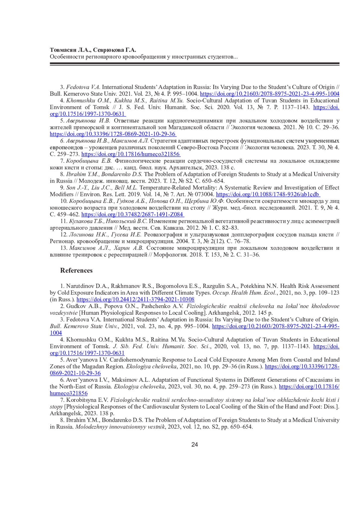 6. Аверьянова И.В., Максимов А.Л. Стратегия адаптивных перестроек функциональных систем укорененных европеоидов - уроженцев различных поколений Северо-Востока России // Экология человека. 2023. Т. 30, No 4. С. 259-273. DOI: 10.17816/humeco321856 EDN: EPDVUK