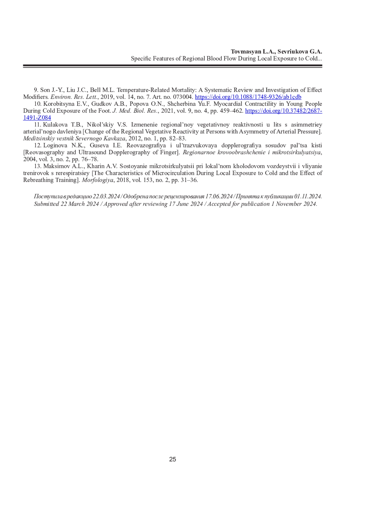 7. Коробицына Е.В. Физиологические реакции сердечно-сосудистой системы на локальное охлаждение кожи кисти и стопы: дис.... канд. биол. наук. Архангельск, 2023. 138 с. EDN: DHIXUN