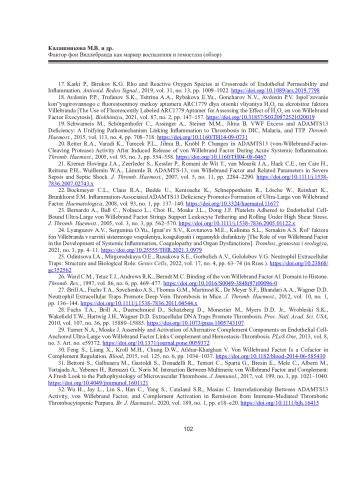 2. Автаева Ю.Н., Мельников И.С., Васильев С.А., Габбасов З.А. Роль фактора фон Виллебранда в патологии гемостаза // Атеротромбоз. 2022. No 2. С. 79-102. DOI: 10.21518/2307-1109-2022-12-2-79-102 EDN: BISWLG