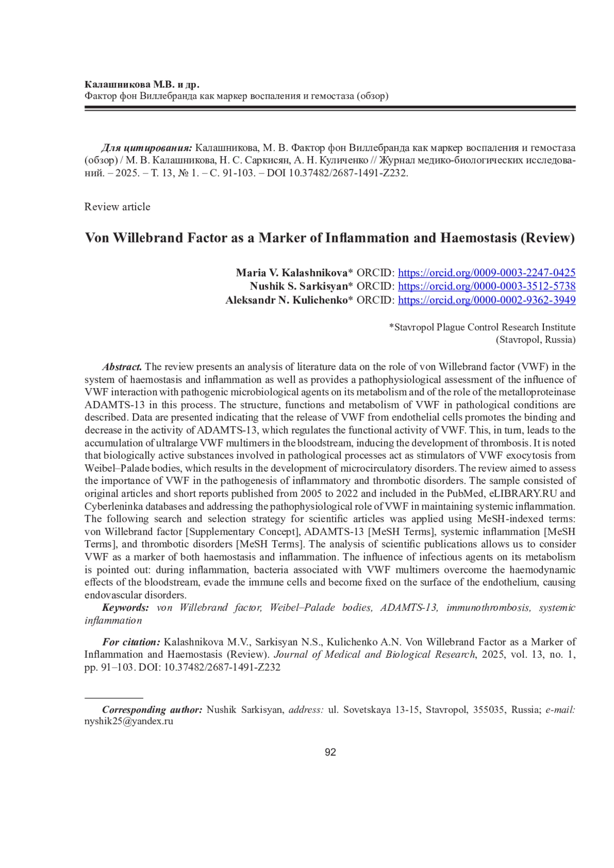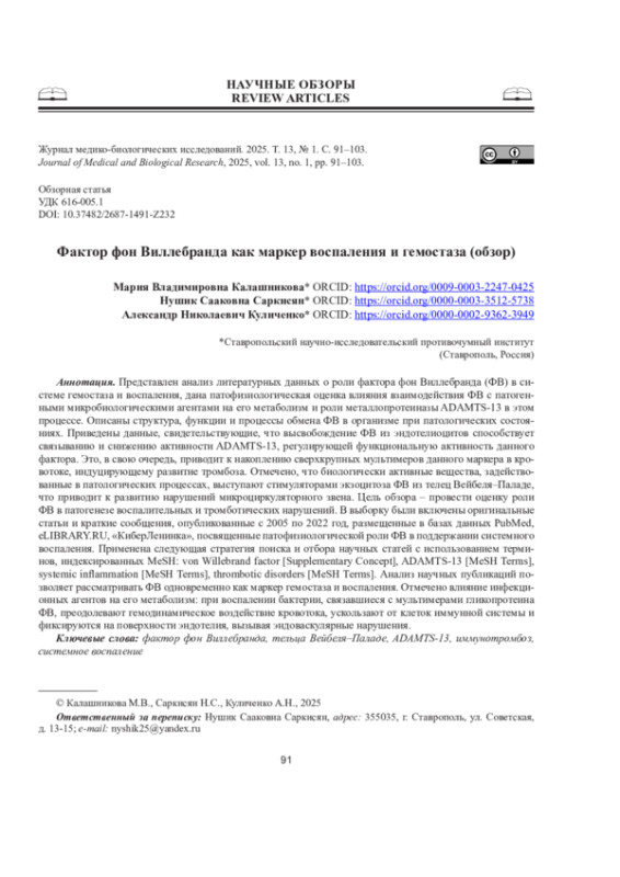 13. Охота С.Д., Козлов С.Г., Автаева Ю.Н., Мельников И.С., Габбасов З.А. Фактор фон Виллебранда и сердечно-сосудистая патология // Атеросклероз и дислипидемии. 2022. No 4 (49). С. 10-24. DOI: 10.34687/2219-8202.JAD.2022.04.0002 EDN: PGZLRT